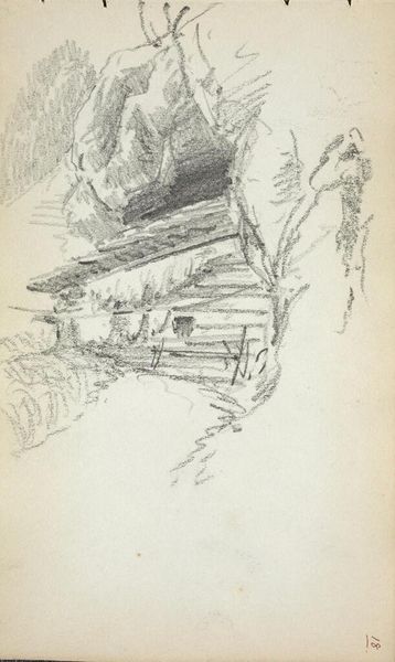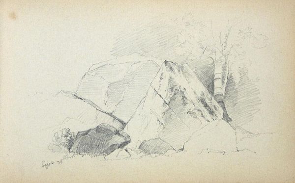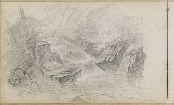 Editor: So, here’s a pencil sketch called "Rocky Landscape with Stream" by Benjamin Champney. I find the scene quite calming, almost meditative. What do you see in this piece? Curator: It whispers to me of untouched wilderness, a secret spot only the artist knew. The hurried pencil strokes feel like a stolen moment, a fleeting impression captured on paper. Do you feel a sense of immediacy in the lines, as though Champney just had to get it down before the light changed? Editor: Absolutely! It feels very spontaneous. I noticed the figure on the left; what is his role in the image? Curator: I think the figure provides scale and a sense of adventure. He’s a tiny human dwarfed by the grandeur of nature, maybe searching for his own secret spot. It makes me wonder what he's thinking, doesn't it you? Editor: Definitely, it adds a human element to the wild. This has made me want to explore this landscape in person, even though it's just a sketch. Curator: Right? It’s a window into another time, another way of seeing the world.
