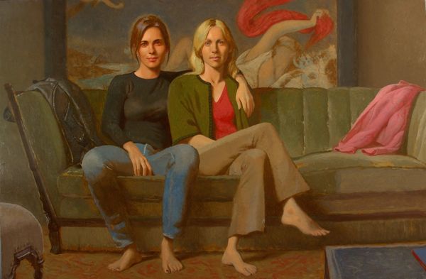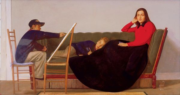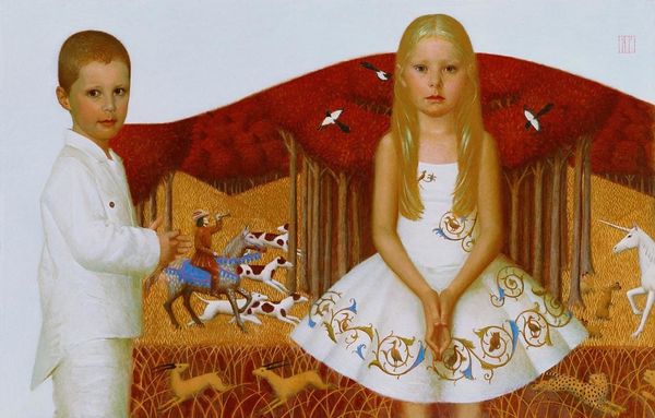 Curator: Bo Bartlett's 2020 oil painting, "The Thin Veil," depicts a rather intriguing gathering of figures in an outdoor setting. What's your first impression? Editor: It feels… unsettling. There’s something deeply strange and yet familiar about the composition. The muted palette adds to a sense of subdued anxiety; like a dream, perhaps. Curator: That resonates. Bartlett’s work often explores themes of American identity and contemporary culture through a lens that challenges conventional notions of representation and often pushes the boundaries of realism. Notice how the figures, seemingly adolescent women, are adorned with unusual, cone-shaped headwear, in an otherwise realistic scene. Editor: Right, those metallic cones – are they meant to invoke tin foil hats? A commentary on paranoia, conspiracy theories, the "thin veil" of the title suggests they see a truth hidden from others, the absurdity becomes poignant. The headwear could represent the weight of societal expectations and the characters acting as vehicles to dissect such ideas. Curator: Interesting. It raises the question of power, doesn’t it? These could very well reference historic imagery or groups marginalized within society. We have the institutional backdrop of, perhaps a school context in terms of their outfits and, if those indeed allude to tinfoil hats, the wider context is, of course, media, public perception and maybe manipulation too. Editor: And look how isolated they seem. Though presented as a group, they exude individuality. Each distinct in expression, they appear distant in manner and the uniformity created through the metallic cones ironically adds more dimension to their characterization and, on the whole, to their intersectionality and individuality, challenging perceptions. Curator: Definitely. The landscape too plays a vital role. It contributes to a mood of unease as a kind of stark, psychological landscape that mirrors their interior states. Its flatness amplifies that isolated mood you described. What do we make of the title then? Editor: "The Thin Veil" feels almost self-aware in the artwork. It represents so many dualities: it's a reflection on how identity is both presented and perceived. The painting prompts us to think about these complex questions on representation. What a potent image! Curator: Precisely, highlighting the nuances embedded in seemingly familiar realities. Food for thought!