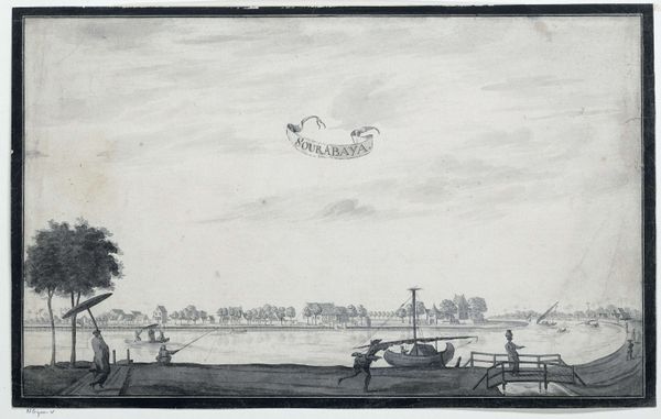 Curator: A first impression—the muted palette lends a certain tranquility, almost dreamlike quality, to this pen and ink drawing. Editor: Indeed. We’re looking at “Gezicht op Tegal,” or “View of Tegal,” attributed to A. de Nelly and created sometime between 1762 and 1783. It offers a fascinating depiction of the port town in Java. Curator: The composition is meticulously arranged. Observe how the artist uses receding planes to create depth, guiding the eye from the figures in the foreground to the town’s buildings, rendered in meticulous detail against that pale sky. Semiotically, what might we surmise from the prominence of that "Tegal" banner floating above the scene? Is it merely descriptive, or is it aspirational, imbuing the landscape with symbolic weight? Editor: I would say it is an interesting interplay of the literal and representational, given that, historically, Tegal was an important trading post for the Dutch East India Company. The imagery subtly asserts Dutch presence and perhaps projects their control, both economic and territorial. The sketch shows how power dynamics and imperial ambitions played out. Note how orderly and civilized it looks, unlike stereotypical imagery associated with colonized landscapes. Curator: Absolutely. I would call attention to the line work – consistently delicate, precise in capturing the architectural elements but dissolving in looser marks toward the distant horizon line. The contrast heightens the sense of receding space while drawing attention back to structural stability within the fortified buildings themselves. Editor: Beyond the artistic execution, consider its broader context within Orientalist art of that time. It romanticizes a faraway locale for European consumption, influencing perceptions, both visual and intellectual. How this seemingly placid river scene was received back then, when the colony was under great economic oppression is what makes this particular piece quite relevant today. Curator: I find the interplay between objective observation and stylistic interpretation compelling—evidence, perhaps, of a moment of artistic expression informed by prevailing modes of representation and perspective. Editor: Precisely. Reflecting on the sociopolitical and historical implications embedded within, we start appreciating the nuanced dialog this drawing sparks.
