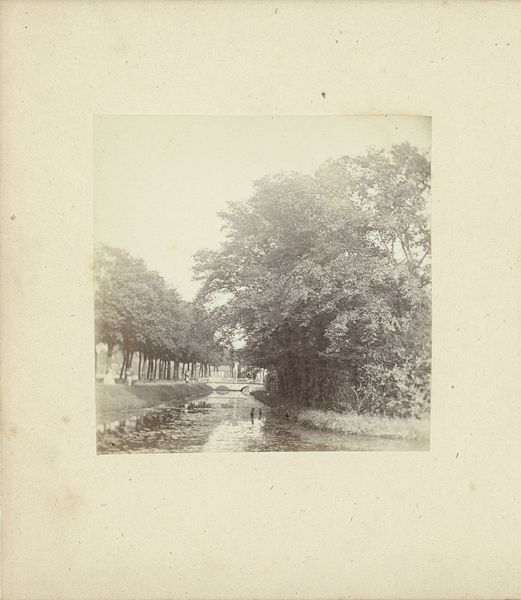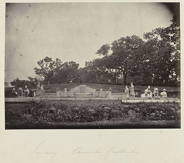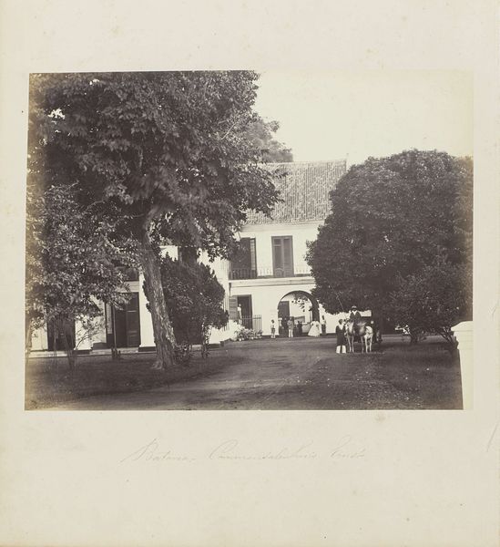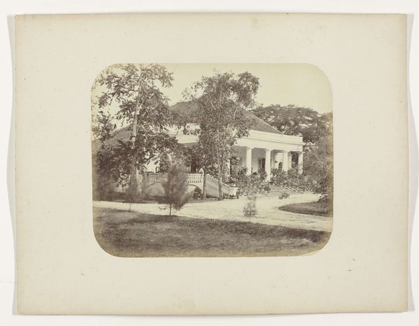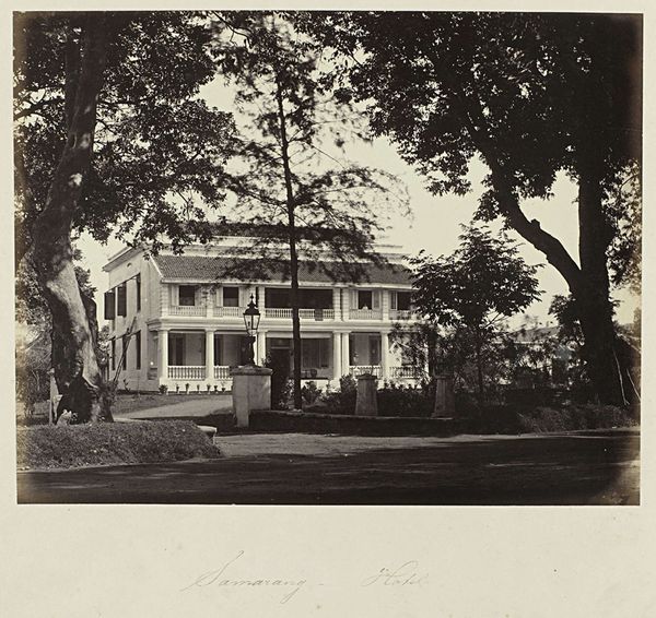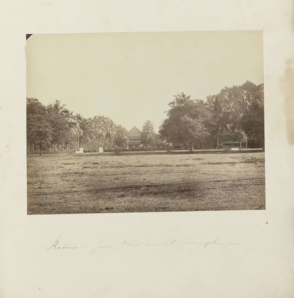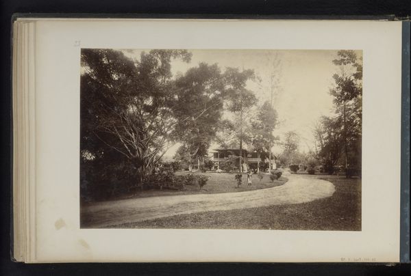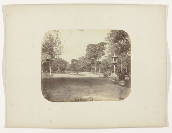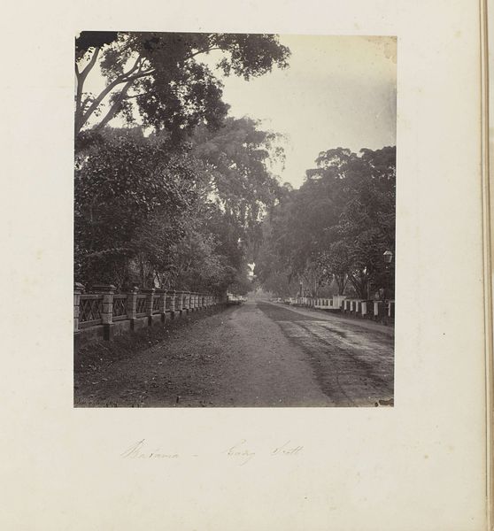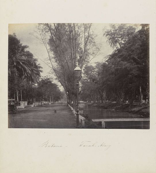 Editor: Here we have Woodbury & Page's "Batavia - Tanah-Abang," a gelatin-silver print dating from sometime between 1863 and 1866. The composition, with its receding road and layered vegetation, is quite striking. What elements do you find most compelling? Curator: Formally, the print presents a sophisticated interplay of light and shadow. Note how the diffuse sunlight, rendered in delicate shades of grey, articulates the texture of the foliage. Consider how the geometric rigidity of the lampposts and fence contrasts with the organic forms of the trees, creating a visual tension that enlivens the image. Editor: It’s interesting how the strict geometry almost feels out of place amongst all that nature. Is that intentional, do you think? Curator: Perhaps. The positioning of the structures bisecting the composition may suggest the imposition of a colonial order upon the landscape. The placement and angles create a depth within the composition as well. Editor: So, the balance between man-made structures and nature helps you understand it through formal qualities? Curator: Precisely. One might view the photographer's deployment of tone, line, and form as not merely representational but also evocative of power dynamics, creating symbolic weight. How does this arrangement impact your understanding of the artwork? Editor: That's fascinating, and it helps me consider the perspective of the photographer in shaping the image. Curator: Indeed, by dissecting its formal strategies, we gain access to its intrinsic artistic and potential social meaning. Editor: I now see it beyond just a picture, viewing it as an intentional arrangement of geometric form that hints at historical themes of control and design!