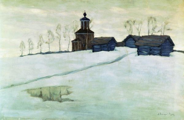 Curator: Before us hangs Claude Monet's "Houses in the Snow," painted in 1895 using oil on canvas. It is quite an intriguing piece from his body of work. Editor: I must say, its immediate effect is rather disquieting, no? The starkness of the white and the shadowed structures create a somber mood. Curator: Indeed, but look closer. Observe the brushstrokes – the deliberate application of paint creating texture that almost mimics the very surface of snow. Note the structure of the house and roof against the surrounding. Editor: That's true. You can almost feel the cold seeping through the canvas. But I'm struck by the physical labour involved in creating such an impasto effect. Consider the hours Monet dedicated to layering the paint to build form on what can seem to be quite featureless landscape. Curator: And there's a subtle beauty in that form, a structural harmony in the relationship between the horizontal ground plane and the simple geometric shapes of the houses. Semiotically, they become almost abstract markers, anchored in the landscape. Editor: Precisely! This evokes questions of resource expenditure, both monetarily in terms of the volume of paint used and in a more bodily way with repetitive movements across a protracted painting process, raising fundamental considerations of the labor, material, and commodity concerning Monet's wider artistic practice. Curator: His dedication to painting en plein air, particularly in these harsh conditions, emphasizes this relationship and underscores the painting's commitment to direct sensory experience. The artwork becomes more than a painting; it embodies time, place, and a perception— frozen by winter, interpreted via artistry. Editor: Right, and considering the context of impressionism— how revolutionary this approach was. Abandoning precise details for sensory impressions— what about the supply chains? The pigments would have come from global sources via industrial processing; the canvases from specialized mills. The infrastructure enabling his impression. Curator: Your analysis broadens our perception beyond the aesthetics, connecting us to the realities behind artistic creation. Editor: And, after analyzing the materiality, the emotional bleakness translates, for me at least, from an art piece, to a meditation of production. A poignant paradox in simplicity.