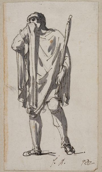 Harmen ter Borch sketched this standing figure of a young man with a cloak in the mid-17th century. The figure's draped cloak and hat are symbols of status, reminiscent of classical attire. The way the cloak is worn, draped over one shoulder, echoes the ancient Roman toga. The toga, originally a practical garment, evolved into a symbol of citizenship and authority. We see echoes of this in Renaissance portraiture, where draped fabrics signified learning and refinement. Consider, too, the slouching figure, a motif of melancholy that reminds us of classical depictions of mourning figures from antiquity. This recurring theme links Ter Borch's youth to a larger, timeless expression of human emotions. It's a powerful connection, engaging viewers on a subconscious level.