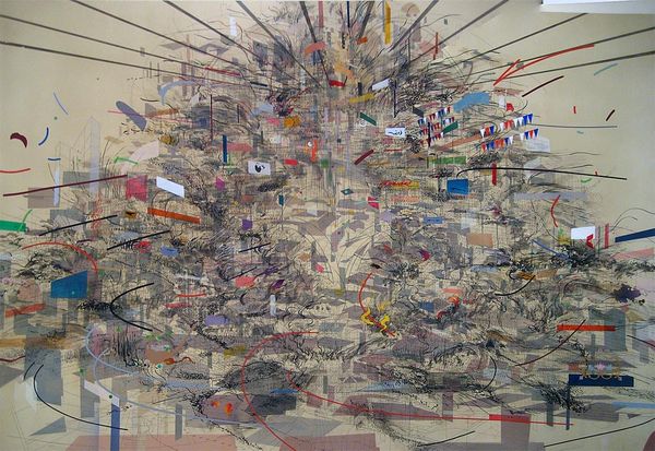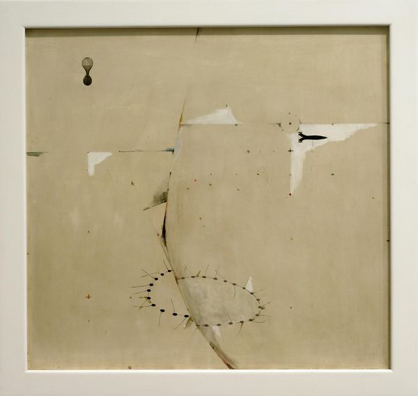 Curator: What a wonderfully chaotic space. Leland Rice’s “Gale Studio – Painted Floor With Spoon,” created in 1979 using mixed media, really captures a moment frozen in time. Editor: My first impression is, "organized chaos". It looks like an explosion of creativity, paint splatters everywhere, but the tools are still discernible among the mess. Curator: Absolutely. Rice often explores spaces dedicated to creation, offering a glimpse into the artist's studio, and in doing so highlights the socio-cultural position of artists in the late 20th century. It speaks volumes about the value we place on the spaces where art is made. This image captures not just a physical location, but a cultural attitude towards creative labour. Editor: The humble spoon amid the paint streaks – it strikes me as almost totemic. Spoons carry symbolic weight across cultures; nourishment, perhaps transformation through mixing…and of course, the artist consuming their creativity in order to continue production. Curator: That's a fantastic point. This reminds me that process art really came into its own during this time, foregrounding how art is made as a theme in and of itself. It also speaks to an art market wanting to give the feeling of the artist. This shot delivers the desired feeling directly. Editor: The color palette also is quite striking, very earthy tones. Look at how those reds and browns, set against the off-white walls, evoke a sense of visceral experience – not just seeing the art but feeling the mess, the struggle of bringing ideas to life. Curator: The ephemerality is compelling. It's a moment that's already passed, and we are given the task to assess this "crime scene." Editor: It makes me contemplate how something as fleeting as this becomes permanent when memorialized in a work of art. I really enjoyed pondering this image. Curator: Indeed, Rice is a sharp curator. This painting provides excellent context.
