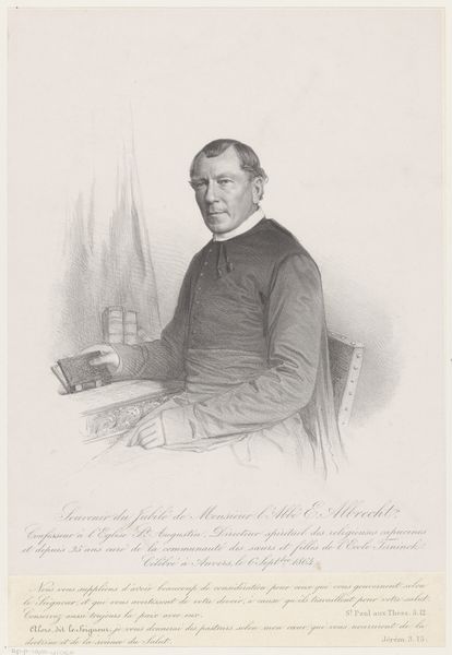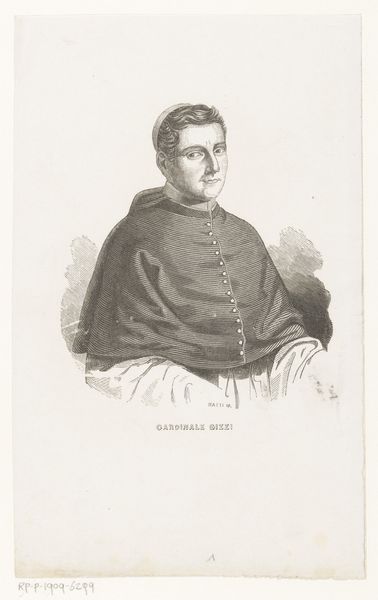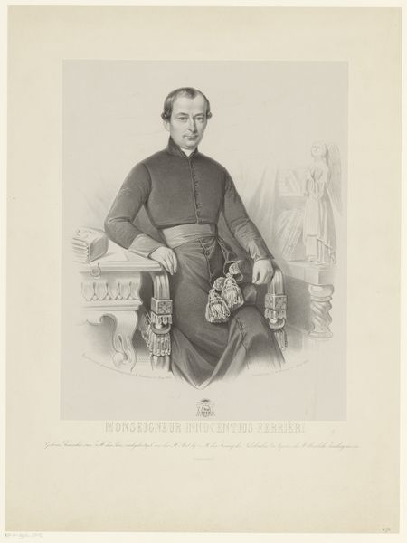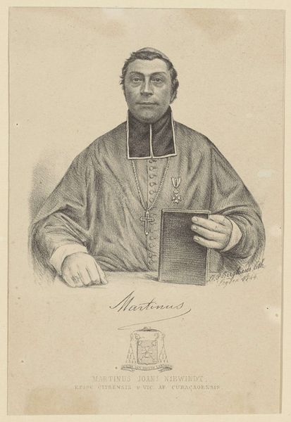 Curator: This is a pencil drawing of Jacobus Grooff, made sometime between 1844 and 1851. The artist is Willem Bastiaan van Wouw. It’s currently held in the Rijksmuseum. Editor: What strikes me first is the subtlety of the gradations—how Van Wouw uses the pencil to create such soft modeling. The subject's gaze, combined with the limited palette, gives it a somber tone, doesn’t it? Curator: Yes, the subdued tones definitely add to the gravitas. Grooff was Bishop of Castanea, and Apostolic Vicar of Java, so the religious symbolism is quite important. The cross on his chest, the ring on his finger—these aren’t just decorative; they are emblems of his authority. Editor: Absolutely. Consider the way his garments are rendered—they define and delineate him, establishing hierarchy in the composition. Did he commission the artwork or was it a posthumous homage? Curator: From my understanding, it’s neither. Willem Bastiaan van Wouw was likely commissioned by someone connected to Grooff, or by an institution wanting to commemorate his service in Java. The drawing was created to be printed into a lithograph. Editor: Interesting, and that intention—to translate this drawing into another medium—perhaps informs Van Wouw’s stark realism. The detail in his face, the precision in his clothing. He wants to provide clear information, not to editorialize. Curator: Precisely. Look at the lines of his face—you see age, experience, but also perhaps a certain… sternness. It’s a realistic portrayal meant to convey the weight of his responsibilities, reflecting his leadership role in a complex colonial environment. He likely wanted to present the image of someone dutiful to the missions he led and who dedicated himself to his religious calling. Editor: This makes me reconsider the starkness, doesn’t it? What I first saw as subdued is actually quite powerful in its directness. There is an unflinching quality to it, isn’t there? Curator: It is. The drawing holds an almost iconic quality, serving both as a representation of an individual and of a legacy—of religious influence and perseverance in Java. Editor: Well, it’s a striking piece of work. I've walked away from it feeling both enlightened and humbled, appreciating the skill required to breathe such intensity of expression into something that’s merely made of paper and graphite.
