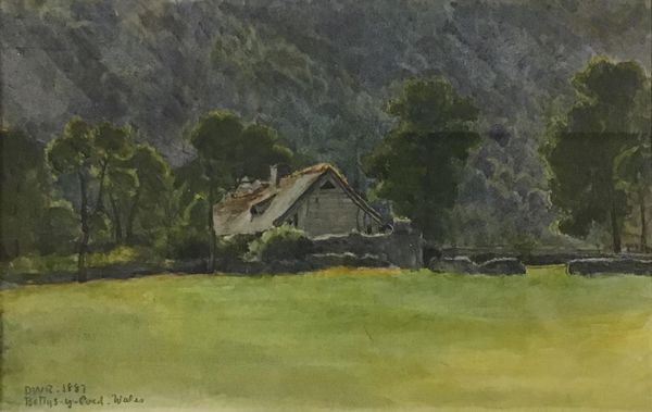 Curator: There's an air of melancholy about this watercolor. It's titled "Abandoned estate at the Belinsko selo", created in 1993 by Alfred Freddy Krupa. The paintwork is loose, evocative... but still, there's a sadness in the scene. Editor: Yes, immediately, I’m struck by that overwhelming stillness, an impression amplified by the hazy rendering of what seems to be a house with two peaked roofs in the shadow of old trees. Even the orange on the façade looks muted, like rust. It feels forgotten. Curator: Krupa was working *en plein air* here, and the impressionistic touches amplify that mood; he really captures that quality of natural light interacting with the dilapidated architecture. The blurring of outlines, almost suggestive of heat haze... Editor: You know, "abandonment" carries so much weight, historically. The economic shifts of the 90s in post-socialist countries, the waves of migration, the neglect of rural spaces... all of that seems to whisper through these quiet strokes of paint. Are there other instances in Krupa’s works where abandonment appears as a theme? Curator: Indeed, many other works address themes of war and its repercussions; his family history bears heavily on these works, as his father was killed during World War II. It's as though these deserted structures stand as silent witnesses to past traumas. Watercolors especially have been known as a means to carry the most heartwrenching and poignant content through landscapes or portraits, such as this one. Editor: The very choice of watercolor is revealing as well. Its fluidity echoes the idea of things fading, disappearing into the past. The image itself almost feels like a memory, indistinct and fading with time. You get a sense that if a stiffer, harsher, artistic style or material had been selected instead, it would have portrayed this idea, but perhaps would've portrayed it as simply anger or hatred for what was happening instead. Curator: A poignant observation, really. These gentle hues become vessels holding historical realities of trauma and post-war decay, turning this unassuming estate into a potent symbol. The transparency and luminosity typical of watercolor painting are apt metaphors for a culture whose memory is ever so gently dissolving in front of the new, now that you mention it. Editor: Thinking about that context certainly adds depth to what might otherwise be seen as simply an aesthetic study of a decaying building. This image is also charged by cultural shifts of this time in that area of the world, reminding viewers to ask about other meanings or feelings brought up by the picture. Curator: Right—that soft touch transforms the image into a vehicle for historical remembrance, ensuring this memory, regardless of how painful, remains to this day in museums and public venues around the world. Editor: A very gentle form of bearing witness.