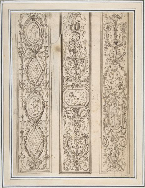 Editor: Here we have an engraving called "Composities met Chinese figuren," or "Compositions with Chinese figures," made sometime between 1686 and 1724, currently at the Rijksmuseum. It reminds me of architectural blueprints but with a playful, decorative twist. How should we understand this kind of art? Curator: This print provides a window into the decorative tastes and global interests of the late 17th and early 18th centuries. Notice how it mixes "Chinese figures" – or, rather, a European idea of them – with baroque ornamentation. How do you think such images were received? Editor: Maybe as exotic and sophisticated? A way for wealthier patrons to showcase their knowledge of the world, or even their access to global trade networks? Curator: Precisely! Prints like these were crucial in disseminating artistic styles and influencing design across Europe. They were not merely decorative; they signaled one’s participation in a global cultural dialogue, reflecting a societal fascination with the “Orient”, even if largely imagined. This fascination played a role in shaping colonial power structures. Do you see any specific elements which speak to colonial structures of power in the composition? Editor: I suppose the idealization of foreign figures hints at the West imposing its own narrative. It is interesting how something seemingly harmless can hold deeper social and political connotations. Curator: Exactly. Studying such pieces challenges us to unpack the visual languages of power and to consider how art functioned within a specific historical and social landscape. What have you taken away from our conversation? Editor: I never thought about decorative art being such a rich source for understanding history. Thanks!
