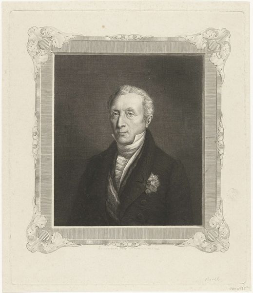 Curator: Today we’re looking at a portrait of Joh. Chr. Plötzer by C. Steckmest, a graphite and engraved print created before 1905. What strikes you initially about this rendering? Editor: The man is stoic. The limited tonal range amplifies that feeling; every line seems deliberate, even somber. He projects such reserve. I imagine a prominent public figure, perhaps one weathered by political storms? Curator: Steckmest’s technical skill is undeniable. Observe the controlled cross-hatching that sculpts the face, building volume through the sheer manipulation of light and shadow. The tight handling and restricted palette further enhance the portrait's rather reserved affect. The geometric shapes give the work solidity. Editor: Yes, but even the severe neo-classical frame becomes part of the story. Notice how it emphasizes notions of enclosure. Is it about containing unruly passions and individual identities into something more acceptable within society? This image of a gentleman speaks volumes about that era. Curator: The composition and formal qualities certainly align with the neoclassical aesthetics that dominated much of the 19th century. There’s a controlled linearity and restraint here, absent of any dramatic gestures or superfluous ornament. Editor: Precisely, and this restriction echoes the larger narrative themes in a Europe still trying to reconstruct identity after great upheaval. I find the subject, the portrait's recipient, as somewhat representing the larger values inherent in western history: a powerful male, and a solid member of that epoch’s power structures. His slightly raised chin gives a very slight appearance of snobbery, and his stern stare does not lend itself to approachability. Curator: Fascinating! Though the composition maintains its equilibrium, this only intensifies his expression, a stark embodiment of the era's principles. The meticulous, calculated design, reveals an artistic process striving towards idealized standards. Editor: Absolutely. And in the portrait's symbols—his tightly knotted cravat, buttoned coat, all are symbols of order, I still consider that it represents those past restrictive ideals, to this very day. Food for thought, indeed! Curator: Indeed. The conversation’s intersection, from artistry to epoch echoes throughout this beautiful neoclassical engraving.