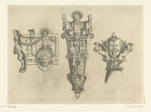 Curator: Today we're looking at a work by Pieter van der Heyden, created in 1567: "Two Vases with Fruit and Flowers in an Ornamental Border". It’s an engraving currently held in the Rijksmuseum. Editor: Whoa, busy! My first thought is, it looks like something you’d find carved into a gothic chair, maybe with a few skulls thrown in for good measure. Dense. Curator: That dense quality you're reacting to speaks to its function, really. These ornamental prints were crucial. They provided patterns for artisans. We’re talking goldsmiths, woodcarvers, all needing design inspiration. The Northern Renaissance, you see, experienced a boom in decorative art. Editor: Right. So it's not necessarily made to be gazed at itself, but to spark *other* creations? I dig that. It’s like a design prompt, overflowing with possibilities. I am getting some playful, dark vibes from these cheeky faces. Are those dead fish dangling beneath the vase on the left? Curator: Indeed. Consider that van der Heyden pulls from the allegorical tradition; things aren't simply what they appear. While fruits and flowers speak to abundance and earthly delights, other motifs can signal darker realities of ephemeral life, especially within the frame of religious morality that pervaded the Netherlands during the rise of the Dutch Reformation. The juxtaposition suggests contemplation beyond mere surface appeal. Editor: A little memento mori mixed in with the pretty fruit. That totally checks. And, like you were saying, because it was intended for other artists, there's this looseness, almost an invitation to improvise with his source material. It breathes despite the intricacy. Curator: Precisely. By understanding the historical context of these prints as more than mere aesthetic objects, we get insight into 16th-century artisan culture and also broader questions surrounding religious change. The emphasis on surface detail also reflects a growing mercantile economy where display, in various forms, was encouraged and celebrated. Editor: It's less a finished product and more a set of blueprints for a party of ideas. And knowing all of that, knowing what it *did*, enriches my viewing. Curator: Absolutely, seeing art as entangled in historical, cultural and religious dimensions provides nuanced understandings of the past. Editor: Yeah, my initial "gothic chair" take feels kinda flat now. Time to go rethink everything I know! Thanks for the insight!