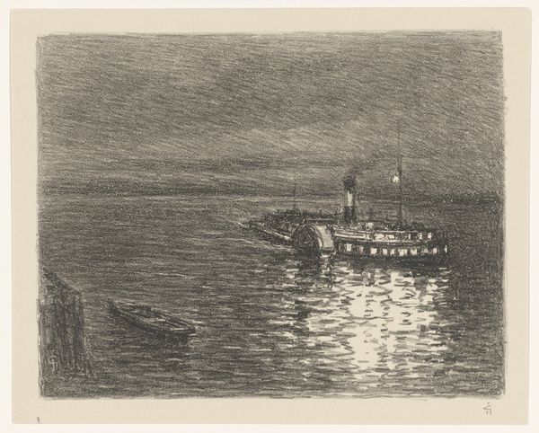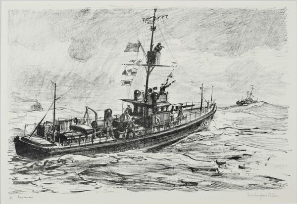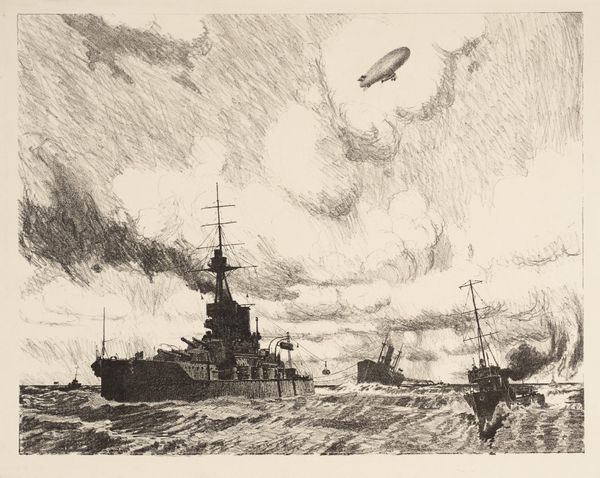 Editor: Here we have Arthur Lismer's "Submarine Chasers," created in 1919. It's an ink drawing, and it's just so dynamic. The lines create such a sense of movement in the sky and the sea. What’s your take on this piece? Curator: I see this work as a powerful commentary on industry and war. The harsh, almost brutal lines of the ink capture not just the visual of the ship, but also the labor embedded in its construction and function. Think about the physical effort required to build and maintain these vessels, the social context of wartime production, and the sheer volume of materials consumed. Editor: So, you're focusing on the 'how' of it, the making and the using? Curator: Exactly. The medium itself, ink, allows for reproduction. Consider Lismer’s choice – he could have painted this. The print quality allows wider distribution, aligning it with wartime propaganda. It speaks volumes about the mass production necessary for wartime machinery. What's emphasized, then, isn't individual skill, but a collective industrialized effort. What do you make of the skyline? Editor: It feels very oppressive. The dark ink and the aggressive strokes make it feel like it’s bearing down on the ship. Curator: Precisely! That oppressive skyline further reflects the societal pressure of the war effort. Every stroke speaks to a world reshaped by industry, labor, and collective action. Editor: I hadn't thought about it that way, focusing on the materials and process, it reveals a whole other layer to the artwork. Thank you for broadening my perspective. Curator: Absolutely! Considering the production methods offers a really different way to understand not just this artwork but the period as a whole.