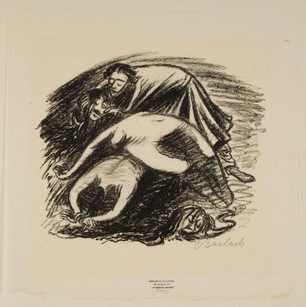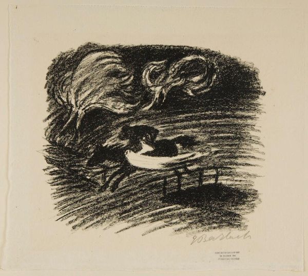 Editor: This is "The Walking Bell 1 [The bell chases the boy]" by Ernst Barlach. It looks like it's made of charcoal, or some sort of drawing medium. The bell is enormous! How do you interpret this work? Curator: The rough texture suggests a rapid, perhaps anxious, execution. The stark contrast emphasizes the materiality of the paper itself, highlighting the economic conditions that shaped art production during Barlach’s time. What does the disproportionate size of the bell suggest about its manufacture? Editor: Maybe the bell represents overwhelming societal pressures? The medium itself seems so raw. Curator: Indeed. And consider the labor involved in bell-making, a process often hidden from view. Barlach brings it to the forefront. Editor: That adds a new layer. I see the focus on production now. Curator: Exactly. This piece reminds us to question the means and conditions of artistic and industrial creation.