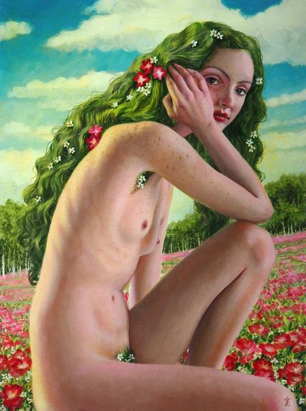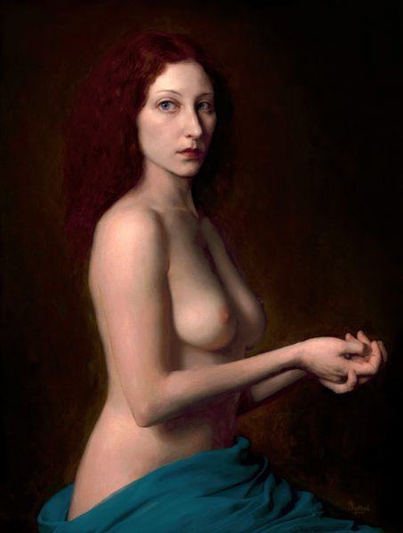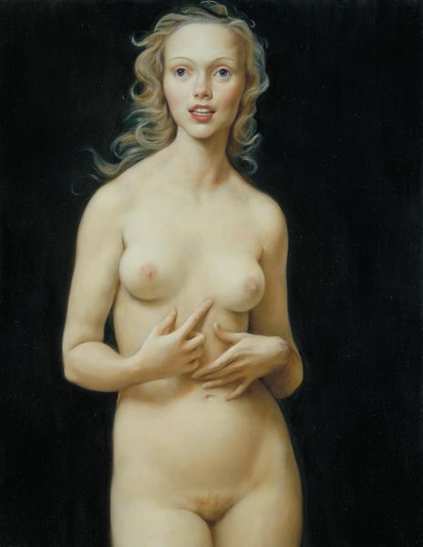 Editor: So, this is "Feather Duster," an oil painting by Rose Freymuth-Frazier from 2007. I find it intriguing, a portrait, almost classical in style, but with this modern, unsettling edge. What's your read on this? Curator: It strikes me as a powerful commentary on the role of women, both in art history and contemporary society. The pose is reminiscent of traditional nudes, but the feather duster subverts that expectation. Editor: Subverts how exactly? Curator: Consider the title itself: "Feather Duster." It’s domestic, subservient. By placing this object in the hand of a nude figure, the artist juxtaposes ideals of beauty and objectification with labor and expectation. How does that contrast strike you? Editor: It feels like a challenge to those traditional depictions, almost an ironic take on the male gaze. She’s holding this symbol of domesticity, but her expression and nudity don’t suggest servitude. More like defiance? Curator: Precisely. The dark background amplifies this feeling, suggesting a removal from any domestic scene and isolating the figure within the artwork. The gallery context plays into this too: it places the painting within a dialogue about how we look at and consume images of women. Who is the subject of this gaze, and what does that tell us? Editor: So, it's less about pure aesthetics and more about prompting viewers to confront societal expectations and the politics of looking? Curator: Exactly. It pushes the viewer to consider the historical baggage of portraiture and its potential to reinforce or challenge social norms. It makes you think about the role that art plays in this wider cultural conversation, doesn't it? Editor: I hadn't considered all the layers, but it definitely provides more context to understand this work. Thanks! Curator: My pleasure. Understanding the social context gives a powerful frame to view art, doesn't it?