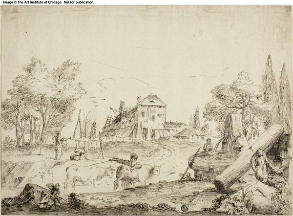 Editor: This drawing, "Pastoral Landscape with Shepherd and Cattle," by Bernardo Zilotti, features a shepherd with his livestock in a countryside setting. It looks like it's rendered in pen, ink, and chalk on paper. The delicate line work really gives it an ethereal feeling. What stands out to you most about this work? Curator: I am particularly drawn to Zilotti’s method. Notice how he uses pen, ink, and chalk – accessible materials – to depict this "pastoral" scene. It evokes a certain manufactured romanticism. What does this combination of materials, readily available and perhaps inexpensive, suggest about the intended audience or the function of this artwork? Editor: Hmm, maybe it speaks to a broader consumer base? That it wasn't just for wealthy patrons, but perhaps a middle class that was also developing an appetite for art? Curator: Precisely! And consider the subject matter: a shepherd and cattle. These elements celebrate a certain rural simplicity, even as urbanization was drastically changing society. It is not real labor being represented. How might Zilotti’s process and material choices be intertwined with the social realities of his time, offering a commentary on both labor and leisure? Editor: So the drawing itself, the ease of production through these materials, clashes with the idea of idealized rural life, potentially revealing the constructed nature of the pastoral scene? Curator: Yes, exactly. The apparent simplicity of the drawing process belies the complex socio-economic factors at play. Editor: That gives me a lot to think about in terms of how materials and art are deeply intertwined! Curator: Indeed, seeing art through a materialist lens gives us invaluable insight.