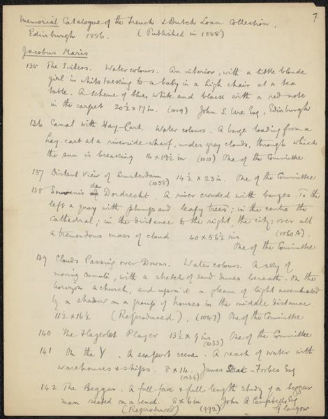 Editor: This is “Sugar Merchant's Suit (Written Description),” a series of ink drawings on paper, created by Henry De Wolfe sometime between 1935 and 1942. At first glance, the handwriting feels almost like a coded message or some forgotten script. What symbols or meanings do you see in this piece? Curator: The immediate sense is one of preservation. The detailed descriptions, almost obsessively noted, remind me of the Kabbalistic impulse to meticulously define and record the Divine, fearing its loss. Here, the garment, probably signifying status, is rendered textually rather than visually, hinting at its potential disappearance. Editor: That’s interesting. I hadn't considered the idea of loss or disappearance. The lists give an imperative tone as if this needs to be precisely replicated somehow. Curator: Yes, there is an element of imperative, wouldn’t you say? Consider what it meant to catalogue possessions in a time of potential economic or social upheaval. Are they instructions or almost a kind of will or testament, symbolically preserving that status? The garment, meticulously itemized, may become a cultural and personal touchstone that echoes forward, resonating with viewers in uncertain times. Editor: So the “suit” acts almost like a historical document or memory palace. Instead of seeing a garment, we’re seeing a symbol of something larger than its own sartorial function. Curator: Precisely. It’s a way of fixing identity and history at a specific moment. We look to symbols and their deeper connections, which allows us to better interpret visual culture and psychological state. Editor: This has given me so much to consider about the layering of symbolic importance in what seems like a fairly straightforward list. Thanks! Curator: My pleasure! It is through these careful notations that even the everyday transforms into an enduring symbolic statement.