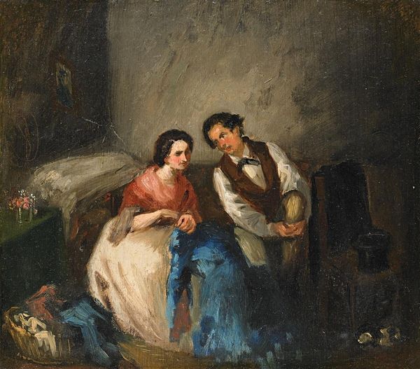 Noè Bordignon’s oil on canvas, "Eating near the hearth," invites us into an intimate scene of domestic life. Bordignon, painting in the late 19th and early 20th century, lived through a period of significant social change, shaped by industrialization and the rise of national identities. This work depicts a family gathered in the humble setting of their home. The dim light and sparse surroundings speak to the realities of poverty. The mother, caught in the act of mending clothes, embodies the labor often unseen, yet crucial for survival. The children, their faces lit by the fire, represent innocence and vulnerability. Bordignon doesn’t shy away from depicting the hardship of working-class life. Instead, he draws our attention to the resilience and dignity of a family amidst these conditions. The act of eating becomes almost sacred. Bordignon captures the tenderness and struggle inherent in everyday life.