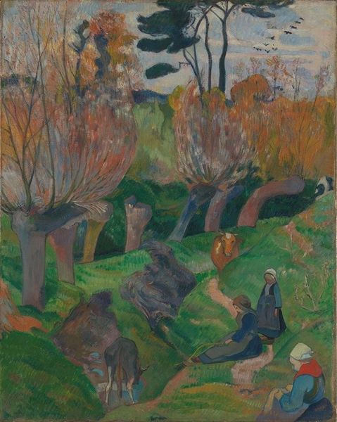 Editor: We are looking at Henri Matisse's "Renoir's Garden", painted in 1917 using oil. The vibrant brushstrokes and lush foliage create a surprisingly intimate and serene scene, it almost feels like stumbling upon a hidden grotto. How do you read the symbolism within this piece? Curator: This garden is not simply a representation of nature; it is an encoding of artistic lineage. Notice the white sculpture nestled amongst the riotous colour. It invokes classical statuary, emblems of idealized beauty, set against a Fauvist landscape of almost clashing hues. Do you see the tension? Editor: I do! It's like the past and present are colliding. The statue feels almost ghostly compared to the vibrant flowers. It looks like he is both embracing tradition and simultaneously pushing against it. What’s the significance of using Renoir's Garden as inspiration? Curator: Precisely. The title acknowledges a predecessor. Renoir, an Impressionist master, celebrated light and colour. But Matisse, a Fauvist, amplifies them, pushing beyond mere representation. It’s a dialogue with art history, where symbols are re-imagined, echoing previous meanings whilst forging something startlingly new. Consider the statue, a symbol of perfection almost swallowed by the overwhelming vitality of the natural world. Editor: That makes me think about the Fauvist movement’s interest in expressing subjective emotion rather than objective reality, like a personal vision overtaking established ideals. Curator: Yes. Colour becomes emotion. The statue may also symbolize something about immortality and mortality, permanence contrasted against fleeting moments of colour. Ultimately, this garden exists less as a physical space and more as a stage upon which art grapples with its own evolving identity, and visual symbols constantly undergo transformation across cultures. Editor: It is interesting to see how Matisse acknowledges the past while declaring a bold new direction. Curator: Exactly, the garden becomes a symbolic arena for the evolution of artistic vision.