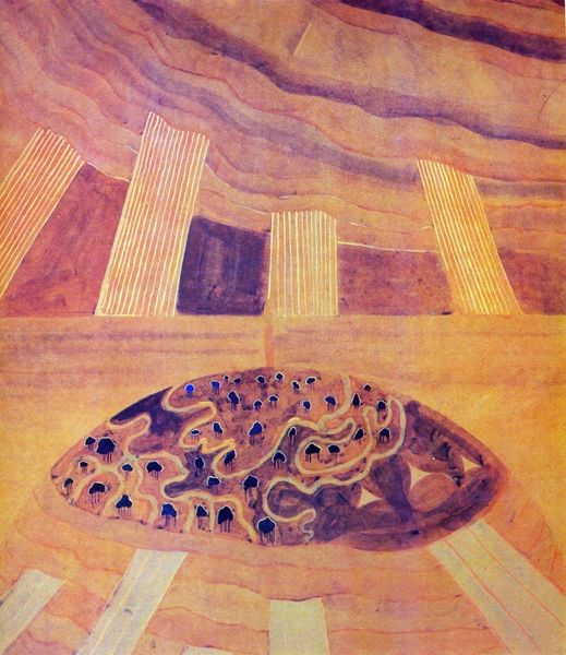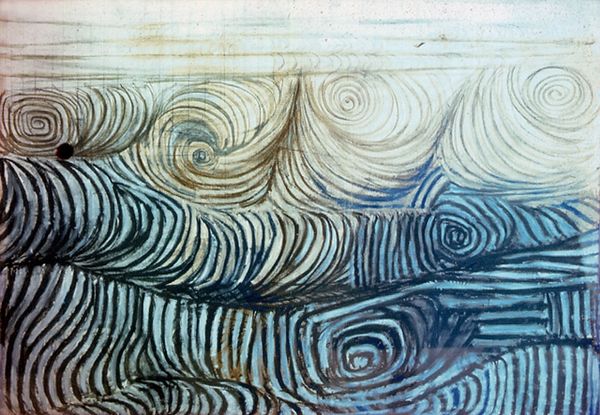 Editor: This is Victor Pasmore’s “Spiral Motif in White, Black and Indigo,” a mixed media piece from 1951. I’m really drawn to the repetitive nature of the spiral and line work. It feels almost hypnotic. What do you see in this piece? Curator: I see a convergence of natural forms and primordial symbols. The spiral, present across cultures from Neolithic rock carvings to Celtic knotwork, often represents the cycle of life, death, and rebirth. It evokes growth, expansion, and the journey of the soul. Does the limited palette inform your impression of this artwork? Editor: Absolutely! The indigo and black against the white background give it a sense of starkness, like an ancient blueprint. But there's also something calming in the repetition of those colours. Do you think Pasmore intended a spiritual connection with this piece? Curator: I think so. After the Second World War, many artists explored abstraction to move beyond the representational, searching for universal symbols to express deeper truths. Pasmore's spirals may reflect a desire to reconnect with something fundamental, perhaps a search for meaning in a chaotic world. Consider also how "primitive" forms in the art of this period signified authenticity, a rejection of Western convention. Do you see other symbols or allusions at play? Editor: I hadn't considered the primitive aspect, but now that you mention it, there’s almost a topographic quality to the texture... like looking at the earth from above. I hadn’t quite appreciated how those color choices reinforce it. Curator: Exactly! And consider the indigo— historically a precious dye, linking this abstract expression with symbolic weight. It shows cultural memory, I think. We could see something new each time we experience this motif. Editor: This has really made me think differently about abstraction! It's so interesting how even simple forms can be loaded with such complex ideas and histories. Curator: Indeed. And recognizing those embedded layers enriches our own personal interaction with the work.