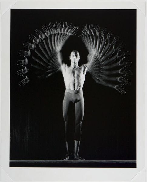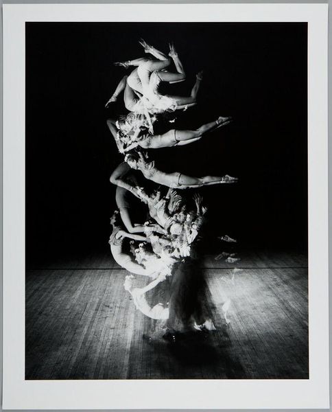 Curator: Here we have Harold Edgerton’s "Foil Trick," a captivating black and white photograph currently housed at the Harvard Art Museums. Editor: Ooh, my first thought is of a ghostly figure, almost like a blurred spirit dancing in the dark. It's kind of haunting but graceful. Curator: Edgerton was a pioneer in stroboscopic photography. What looks ghostly is actually a series of movements captured in rapid succession, all layered within a single frame. Editor: So it's about deconstructing a single moment, breaking it into these ephemeral slices of time. Like a visual echo? Curator: Precisely. Consider the socio-historical context: this image emerges from a period deeply engaged with advancements in science and technology, reflecting a desire to capture and understand fleeting phenomena. Editor: I love how science and art can collide, blurring the lines between objective observation and subjective interpretation. It makes you think about how we perceive movement, and the limitations of our own eyes. Curator: And it also raises questions about representation – how do we capture the essence of a performance, the lived experience of the dancer? Editor: It’s as if Edgerton found a way to paint with light and time. I walked in thinking 'ghost,' now I’m seeing the elegant math of motion. Curator: Indeed, it offers a unique perspective on the body, movement, and the passage of time, framed within the context of technological innovation.