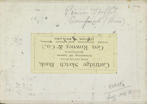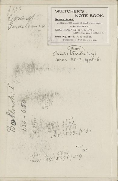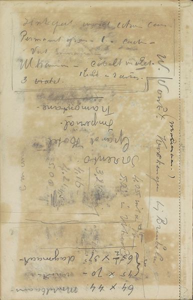 Editor: Right, so here we have Cornelis Vreedenburgh's "Notities," made sometime between 1890 and 1946. It's a mixed media drawing using ink and pencil on paper, currently held at the Rijksmuseum. Looking at it, it feels…almost like a private document. It's just a page filled with scribbles and notes, not really meant for display. How do you interpret this work? Curator: Ah, yes, “Notities.” I love that title, it embraces its raw intimacy, doesn't it? It's like stumbling upon an artist's inner thoughts, their shopping lists juxtaposed with bursts of creative inspiration. Vreedenburgh hands us his beautiful chaos. Look at the varied penmanship. It ranges from the meticulous listing of addresses – *“Mecklenburg 27, Bremen”* – to the cursive swirls and spontaneous ideas trailing downwards, so immediate as if jotted down in a streetcar on a bumpy road. It suggests an artist constantly observing, constantly capturing fragments of the world, ideas, maybe snippets of conversation, am I right? Editor: Definitely! I noticed the London-based “Sketcher’s Note Book” stamp; It adds another layer, implying maybe it was bought whilst travelling, it shows the influences from afar. Curator: Precisely! It is his brain spilled right there for us to study and almost...experience. Imagine if that shopping list inspired some master work, don't you just crave that delicious story behind this image now? Editor: It does make you wonder about all those scribbled out words. What secrets do they hold, haha! Curator: And doesn't that entice the most marvelous story of all, my dear, that *we* create with each new moment staring into the artist's past. Editor: That’s a lovely perspective. It transforms what I saw as just simple notes into a prompt for my imagination!