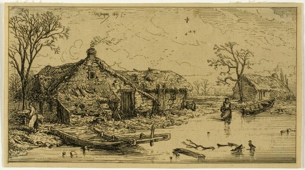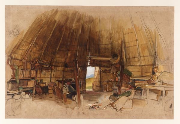 Editor: So, here we have “Palmetto House” a lithograph and drawing from 1890 by The Giles Company, part of the “Habitations of Man” series for W. Duke, Sons & Co. tobacco. It's quite charming, almost like a scene from a storybook. I’m struck by its naivety and the warm colors. How do you read this piece? Curator: Charming indeed, it whispers a tale of simplicity and connection with nature, doesn't it? The artist, or artisan rather, captures a slice of life. But look closer—it's also selling you something. Does knowing that this was essentially advertising shift your perception? Perhaps it becomes less about idyllic rural life and more about…well, aspiration? Editor: That’s a sharp point! I hadn't considered that beyond the obvious. Suddenly, it feels less spontaneous, and more like a carefully constructed image designed to evoke…desire. Curator: Precisely! It makes you wonder who the target audience was, and what kind of "Honest Long Cut Smoking and Chewing Tobacco" they were trying to associate with this scene. It’s intriguing, isn’t it, how commerce inserts itself into art, shaping not just our desires but also how we perceive simpler lives. Does it make you think of modern marketing techniques at all? Editor: It does! This feels like a vintage version of lifestyle branding. The image definitely clashes with our contemporary notions of how we perceive commercial imagery, in an ironic way. Curator: I agree. The line is blurred between reality, representation, and the seductive power of commerce. The artwork challenges what we'd call fine art but shows an interesting story about how marketing affects perceptions of how we envision an aesthetic existence. Editor: This conversation definitely changed my perception of this drawing and print. Thanks for pointing out that the advertising angle is important to our analysis.