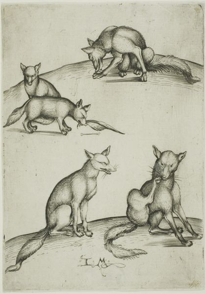 Richard Gaywood created this print of two bears, two wolves, and two foxes sometime between 1630 and 1680. The image reflects the cultural fascination with nature during the 17th century, a period marked by exploration and scientific inquiry. During this time, animals were often used as symbols in art and literature. The choice of these particular animals might speak to the social dynamics of the time: the bear representing strength, the wolf cunning, and the fox, slyness. The composition, with the animals arranged in a seemingly confrontational manner, could reflect contemporary social hierarchies and power struggles. Notice the emotional tension Gaywood creates through the animals' postures and expressions; what stories might they tell? Consider how the artist's depiction of these animals challenges or reinforces societal views on nature and human's relationship to it. How do our contemporary views of these animals differ?