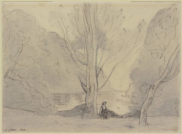 Curator: What we have here is "Sketch of a Flooded Pathway" by Thomas Gainsborough, held at the Tate. It's a small pencil drawing, just over 15 by 19 centimeters. Editor: It feels melancholic, like a memory fading at the edges. All those soft pencil strokes, blurring the trees and the water... Curator: Gainsborough wasn't just about grand portraits. He was deeply fascinated by the English landscape, and this captures his experimental approach, focusing on the immediacy of sketching. Consider the paper itself, and how valuable it was as a commodity. Editor: Yes, but it also evokes something in me – the quiet stillness of a world after a storm. I wonder what was on his mind when he sketched this? Curator: Perhaps he was just trying to catch the light, or maybe considering the social impact of the changing seasons. Editor: Right. I love how a simple sketch can be so evocative, even in its incompleteness. Curator: Indeed. It's a glimpse into Gainsborough's process and the landscape that captured his imagination.