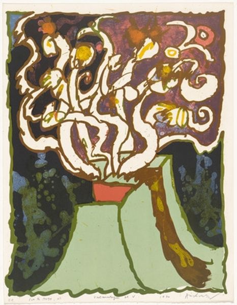 Pierre Alechinsky made this colour print, 'Plate VI from the portfolio Vulcanologies', using lithography. It's like he's thinking through the process, playing with shapes, and seeing what emerges. There's a physicality to this piece, the way the ink sits on the surface, creating textures that invite you to look closer. The volcano is white, kind of ghostly, with these colorful figures surrounding it. I'm drawn to the burst of forms at the top, almost like a thought bubble above the volcano. It’s like the energy of the volcano is expressed as this outpouring of shape. You get the sense of the energy building up to something, or a big burp. This piece reminds me of the work of Joan Miró, in the way that he also uses abstract forms to create a sense of playfulness and wonder. It's all about keeping the conversation going, seeing where the paint takes you.
