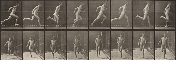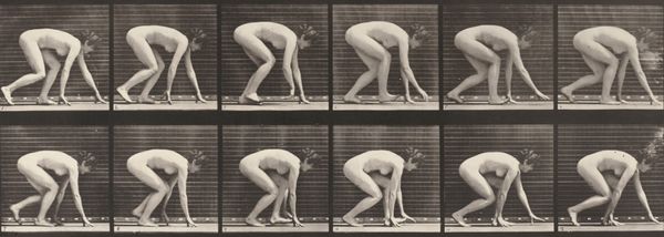 Curator: This is Plate Number 220. Stooping, and lifting handkerchief and turning, by Eadweard Muybridge, created in 1887. It’s a gelatin silver print, part of his series exploring human locomotion. My first impression is the rigidity—the clinical arrangement contrasts with the natural, almost vulnerable human form. Editor: I see it similarly, the rows feel reminiscent of the scientific drive to categorize and dissect that was part of the late 19th-century project. This attempts to deconstruct not just movement, but the very concept of womanhood into component parts that can be understood mechanistically. Curator: Absolutely. Muybridge’s work was fundamentally about understanding the mechanics of movement. Look at how each frame captures a specific moment, broken down, in a time sequence. We should consider that each photograph has been taken in an artificially staged scene, constructed to investigate, step-by-step, a whole process of bodily movement and labor. Editor: It’s also interesting to examine the social context. The figure’s nudity immediately places the image within discourses of both science and art, reminding us of the intertwined histories of the male gaze and objectification, both within art traditions and burgeoning scientific and pseudoscientific disciplines of the time. Her task—picking up a handkerchief—also speaks to the expectation for cleanliness, perhaps echoing then-current bourgeois obsessions with sanitation. Curator: Precisely, and this leads us to understand its mass production. Muybridge intended these photographs to serve a functional, perhaps even pedagogical role, to educate. The materiality is an intentional means to an end. His works were sold as affordable prints and used as tools to be analyzed and manipulated to discover facts about bodies and movements. Editor: Yet, despite the objective pretense, the image itself conveys vulnerability. By stripping down her movement to individual instances, he lays bare some raw human activity to our inspection, which seems oddly clinical. Curator: Perhaps he was ahead of his time! It seems that Muybridge managed to offer tools of technological advancement for a modern understanding of how people worked. Editor: Yes, although viewed now, the stark, systematized recording also provides fodder for a broader critique of how power and scientific ambitions converge in unsettling ways. It certainly forces us to ask about the cost of so-called progress, no?