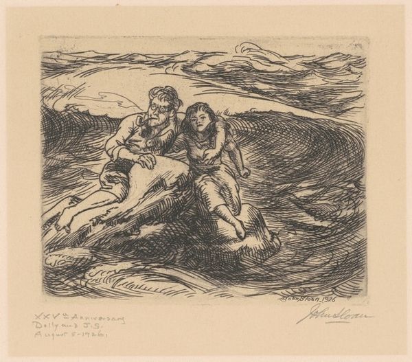 Curator: Hans Thoma, who lived from 1839 to 1924, created "Triton Couple II (Miracle of the Sea)." The work presents two figures emerging from the waves. Editor: The composition is striking, the figures seem almost photographic in their realism, yet placed within a dreamlike, mythic scene. Curator: The imagery of tritons and mermaids speaks to a romantic idealization of nature that was prevalent at the time, a yearning for a world untouched by industrialization. The male figure blowing a conch shell could symbolize a call to return to simpler times, while the female points towards an uncertain future. Editor: The contrast between the sharp lines defining the figures and the more blurred rendering of the waves creates a dynamic tension, drawing the eye across the whole picture plane. Curator: It's interesting to consider these figures in the context of the era's social anxieties about gender roles, the male figure appears to take the lead, yet the female figure points to the future. Editor: Ultimately, the formal elements contribute to a mood of quiet contemplation, it makes you reflect on the relationship between humanity and the natural world. Curator: Yes, a reminder of the power and mystery of the sea, and perhaps our place within it.