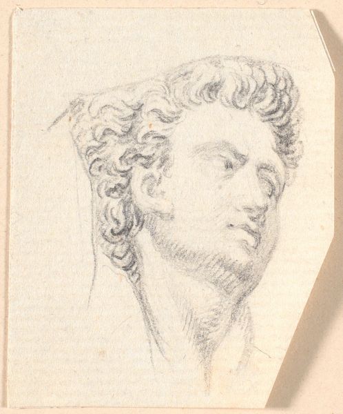 Curator: This is a work titled "Studie eines Kopfes," or "Study of a Head," executed in pencil by Johann Peter Krafft. The image presents a profile view of a male figure. Editor: It’s immediately striking—so classical, but also there’s something almost stark about it, just this single head isolated against the yellowed paper. Curator: Yes, Krafft, positioned as he was within the sphere of Neoclassicism, really evokes a fascination with ideal forms. His figures often reference antiquity, and we can see echoes of Greek sculpture here in the subject's profile and idealized features. There's a specific, if sometimes imagined, history that carries significant cultural weight. Editor: I'm more focused on the physical presence, the mark-making itself. The medium, just pencil on paper, and its simplicity; look at how those tight curls are rendered, almost obsessively, creating depth with such humble material. I find myself contemplating the physical labor embedded within each line. Curator: I see that materiality contributing to its overall impact. The pencil work helps give a human element to an otherwise very classical image. This intersection of classical ideals with, as you said, the humble nature of its creation opens avenues to examine the social politics behind Neoclassical art. Editor: Absolutely. You have to think about the economic conditions that would enable the commissioning of art like this, the accessibility of materials, and the role of the artist as a skilled laborer within that structure. It is not just aesthetics, but a product of production. Curator: Precisely. Furthermore, portraiture inherently addresses questions of identity, power, and representation. Krafft’s choices – the classical references, the subject’s gaze – invite interrogation regarding whose ideals are being memorialized, whose stories are privileged. What does this idealized man signify within 19th century Viennese society? Editor: And how do we reckon with it today, knowing the legacy and implications of that history? For me, focusing on the pencil, on the very physical act of creating the work, can create a connection between the artist's hand, the viewer's gaze, and the weight of history itself. It reminds us that even an ideal is formed through tangible actions, situated labor. Curator: It certainly reveals that tension between artistic creation and cultural construction. Thinking about it further I wonder how its reception varies based on viewers’ individual or communal experiences. Editor: Absolutely! Examining "Studie eines Kopfes" via its materiality allows an anchoring that is vital to understanding our past, in relationship to this…image of perfection.
