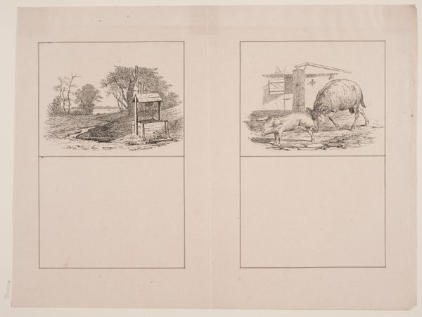 "De to heste; Møllehesten," or "The Two Horses; The Mill Horse," was made by Adolph Kittendorff, and we can see the traces of the artist's hand through the material quality of the print. The image is simple: two horses standing in a field on the left, and one in the stable on the right. The printmaking technique used would have allowed for quick reproduction, bringing images of the Danish countryside to a wide audience. Note how the thin lines create a sense of depth and volume, achieved through careful control of the etching process. The image celebrates the rural labor of horses, and the composition invites us to consider the relationship between animals and labor. The print’s texture, weight, and the linear forms give us a sense of the artist's labor, and also the animal's labor, in a way that is accessible and intimate. This work exemplifies how art can connect us to broader social and economic realities of the nineteenth century.