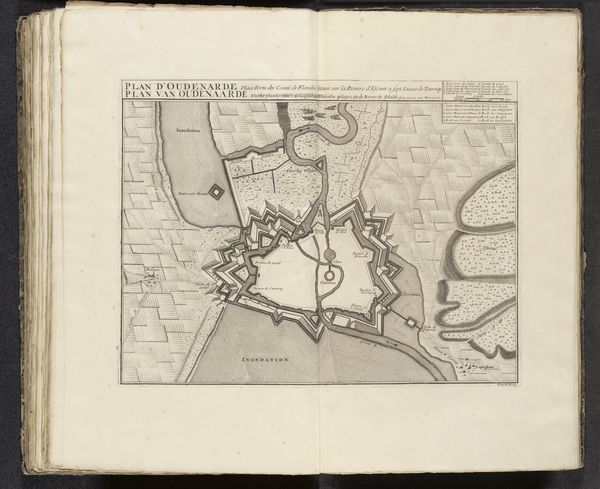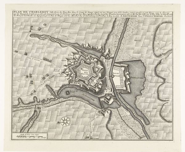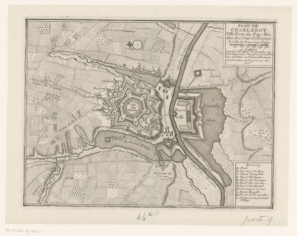 Editor: This is an engraving titled "Vestingplattegrond van Charleroi", which translates to "Fortified Map of Charleroi," created sometime between 1693 and 1744. The map is an intriguing birds-eye view; almost sterile at first glance because it’s absent of people. What jumps out to you? Curator: Oh, sterility is the *last* thing that comes to mind. I see it vibrating with tense intention. Maps like this are as much about projecting power as documenting place. They embody control—a silent boast. Note how the fort is meticulously designed. Geometric shapes imposing order upon the landscape. A show of Baroque bravado! Does it feel a bit…oppressive? Editor: I see what you mean. There's a lack of…organic feel. Were maps commonly made like this at the time? Curator: Absolutely! The 17th and 18th centuries were booming for cartography. Especially military cartography. Cities became strategic assets. Think about Louis XIV's France - vaunting authority by way of cartographic displays of architectural might and control over landscape. Did the exercise in illustrating authority render that desired state real? Or perhaps was reality being sold via carefully illustrated hope? Editor: It’s so interesting how something as seemingly objective as a map can be such a powerful cultural artifact. Almost a form of propaganda, when you consider it. Curator: Exactly! It is no different than any photograph one may take and edit now to elicit a specific mood. It changes your sense of space, history, everything really. A beautiful, yet terrifying control of how you perceive the world. Editor: I’ll definitely look at maps differently from now on! Thank you.