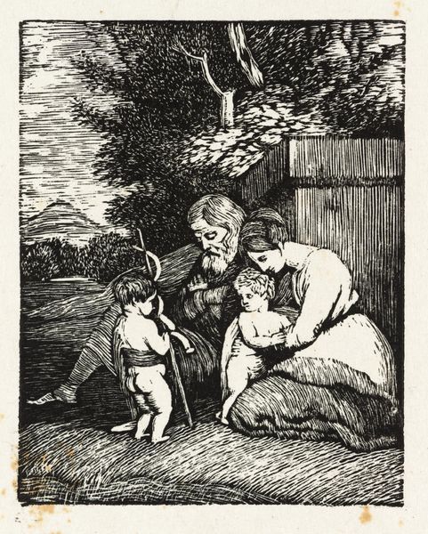 Editor: This wood engraving is by John Linnell, and currently unnamed. The high contrast and dense lines create such a dramatic effect. What cultural narratives do you see embedded in this image? Curator: The scene evokes the Holy Family's flight into Egypt. Notice how the lines create a sense of urgency and shadow, echoing themes of exile and protection. The staff held by Joseph is both a tool for a journey and a symbol of authority. Editor: It does feel like a precarious moment, captured in stark detail. I hadn’t considered the staff as a symbol of authority. Curator: Consider how the image resonates with broader cultural anxieties about displacement and sanctuary. It reminds us that certain images maintain power across centuries, stirring shared emotions. Editor: Thank you, that really reframes how I view the image. Curator: Indeed, art invites us to reflect on the enduring power of visual language and our shared history.