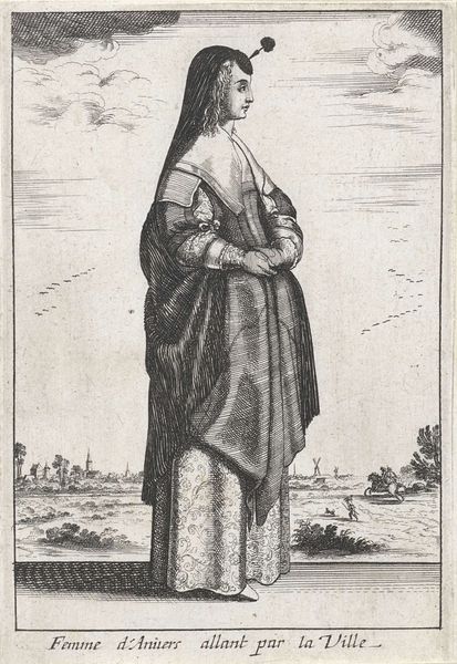 Editor: Here we have "Woman Seen From Behind" by Jean-Antoine Watteau. It's a small print, almost intimate in scale, and I'm struck by the texture created by the etching technique. What formal elements stand out to you? Curator: The line work, certainly. Notice the economy of the marks used to define form and texture, especially in the rendering of the dress. How does the artist create a sense of depth with such limited tonal range? Editor: I see it in the varying density of the lines, creating lighter and darker areas. It’s almost like he's sculpting with ink. Curator: Precisely. And consider the strategic placement of the figure within the pictorial space. The figure's position, slightly off-center, affects how we engage with the surrounding landscape. Editor: It's been so helpful to look closely at how Watteau uses line and composition. Curator: Indeed. A focused examination reveals the artistry embedded in seemingly simple forms.