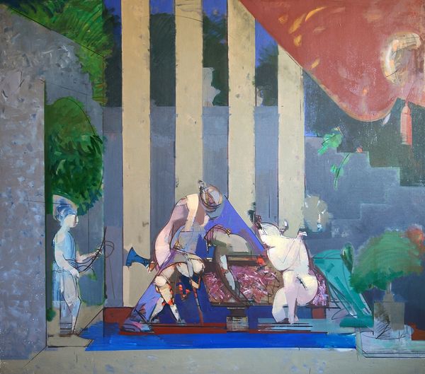Editor: Arsen Savadov's 1998 C-print, *Collective Red*, presents a startling scene. My first impression is…confrontational. The mix of raw meat, bare skin, and formal attire creates a sense of unease. What do you see in this piece? Curator: Beyond the shock, I see a powerful commentary on power, exploitation, and the performance of identity. Savadov places bodies, both human and animal, within a stark industrial setting. How does the presence of the matador figure strike you, juxtaposed with the slaughterhouse workers and the almost sacrificial male nude? Editor: The matador feels completely out of place, like a symbol of performative masculinity inserted into this gruesome reality. Almost mocking it. Curator: Precisely. Consider the political context of the late 90s in Ukraine, a period of intense social and economic upheaval. Savadov often used provocative imagery to critique post-Soviet realities. Do you see echoes of that in the photograph? Editor: I think so. The raw meat could symbolize the brutal realities of the transition, while the matador embodies a kind of false heroism. There’s a tension between the idealized image and the messy truth. Curator: Exactly. The nude figure, vulnerable and exposed, also complicates the picture. He's part of the 'collective' of the title. His nudity might serve as commentary on powerlessness. Think about how these symbols challenge the viewers understanding of nationhood and labour? Editor: I see it. I hadn’t thought about the powerlessness aspect so directly before. Curator: And does situating it within this sociopolitical frame impact how you feel about the work, perhaps beyond your initial reaction? Editor: It definitely gives me a richer understanding. It moves past shock value and into something deeply critical of society and identity. Curator: Indeed. Art can and should act as that mirror, and through these complex narratives, challenge us.