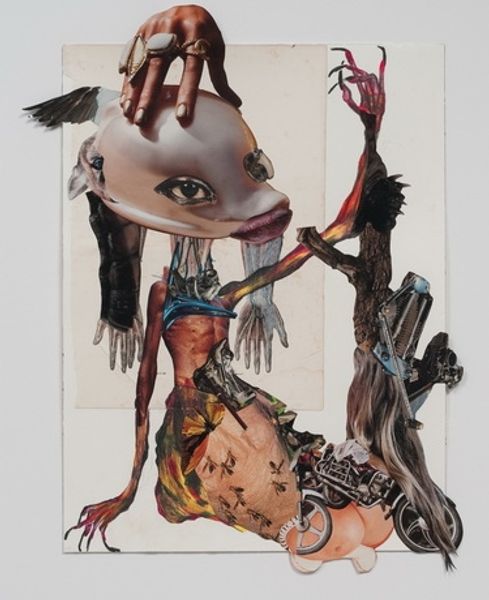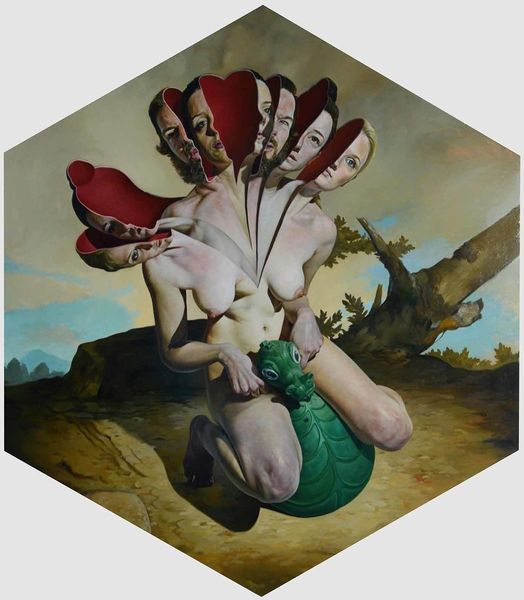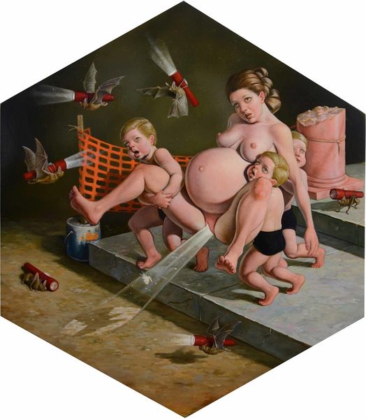 Art Historian: Editor: This is "The Davidsons," an oil painting created by Ashley Bickerton in 1997. The figures are quite… jarring. The contrast between the hyper-realistic rendering of flesh and the overall strange, unsettling scene is striking. How do you interpret this work? Art Historian: Intriguing. Initially, I am drawn to the formal relationships within the composition. The artist utilizes a distinct contrast, setting the grotesque, almost fleshy mound against the emaciated figure. Notice the use of a limited color palette dominated by earthy tones, punctuated by these blue planes on the emaciated man’s head which seems so very flat.. Tell me, does the starkness of the two juxtaposed figures speak to you at all? Editor: Well, it feels very unbalanced, which makes it hard to reconcile! The balloon and confetti seem festive but entirely at odds with the characters. I am confused by the lack of any unifying elements! Art Historian: Precisely. This lack of visual harmony is paramount. Observe how the artist employs different painterly techniques. The rendering of the figure on the right, for example, contrasts starkly with the mass to the left, which lacks precise contours. The balloon on the left is not just a shape. What might these subtle shifts signify? Editor: Perhaps the discordance is intentional? Maybe the piece reflects some sort of conflict or the deconstruction of an ideal, hence the lack of uniformity or cohesive imagery… I guess it challenges conventional beauty standards. Art Historian: An astute observation. And these aesthetic tensions create the very fabric of the painting itself. A lot of emphasis is directed at what's "aesthetically pleasing" so this really seems to throw that concept onto its head, which might have been intentional, maybe a bit accidental, maybe he really struggled. Editor: Thanks, that was an enlightening way to approach the piece by focusing on the elements in themselves. I am definitely seeing more nuance now! Art Historian: Likewise, your response has further enriched my own understanding of Bickerton's work.