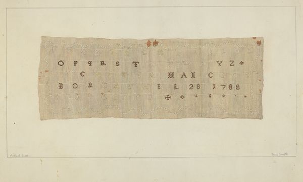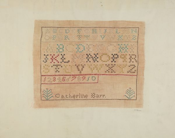 This embroidery sampler was made by Elzy J. Bird. The composition features rows of carefully stitched letters, numbers, and decorative motifs, creating a grid-like pattern that is both orderly and visually engaging. The muted tones of the threads against the neutral background evoke a sense of history and tradition, while the subtle variations in color and texture add depth. The sampler’s structure can be interpreted through the lens of semiotics. Each row functions as a sign, encoding cultural values related to literacy, domesticity, and craftsmanship. The presence of alphabets and numerals underscores the importance of education. The decorative elements such as crowns and floral patterns introduce additional layers of meaning, possibly alluding to notions of royalty and nature. The act of stitching itself becomes a form of communication, reflecting the artist’s skill. The overall effect is one of quiet beauty. This embroidery sampler is a testament to the enduring power of art to convey meaning through form, color, and texture.