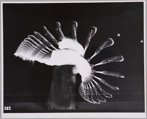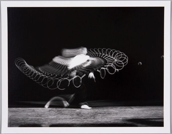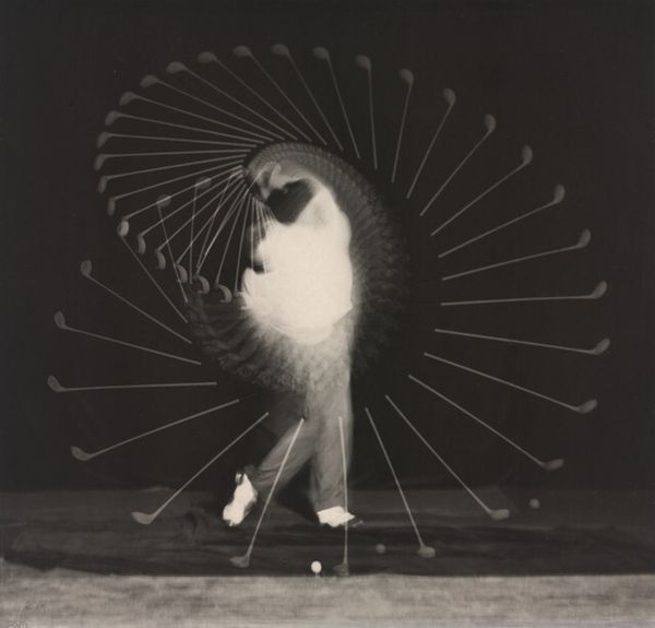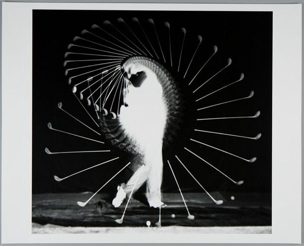 Editor: This is Harold Edgerton's "Gussie Moran" from the Harvard Art Museums. It captures a tennis swing using stroboscopic photography. The ghostly image of the athlete seems suspended in time. What do you see in this piece? Curator: Beyond the striking visual, I see a commentary on women’s evolving role in sports. Gussie Moran was known for challenging conventions, even her tennis attire caused a stir. Edgerton captures her power, but also hints at the scrutiny women face when stepping outside societal norms. Editor: So, it’s not just about the science of capturing motion, but also about the social context of the athlete? Curator: Precisely. Consider how women athletes are still navigating issues of representation and respect today. This image becomes a lens through which to examine those ongoing dialogues. Editor: That's a powerful point. I hadn't considered the social implications. Curator: Art often functions as a mirror, reflecting both the past and the present. Hopefully, this has expanded your understanding. Editor: Absolutely. Thanks for sharing this.