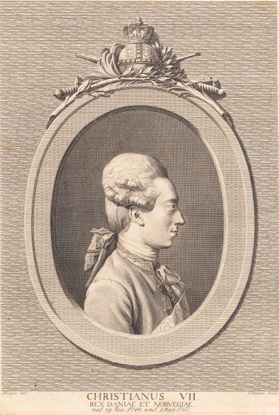 Editor: This is an engraving of Christian VII, King of Denmark and Norway, created sometime between 1754 and 1811 by Andreas Stöttrup. The precision is incredible, almost photographic, though the overall effect feels quite formal and distant. What strikes you when you look at it? Curator: I see a careful construction of power. The Baroque opulence blending with nascent Neoclassical restraint speaks volumes about the anxieties of the ruling class at the time. What is power in the age of enlightenment? It is interesting how the artist employs printmaking, which is considered democratic, to portray aristocracy. Editor: Anxieties? Can you expand on that? Curator: Absolutely! Consider the late 18th century context: revolutions are brewing, old orders are collapsing. The image presents Christian VII as a figure both divine – symbolized by the crown and wreath – and earthly, but is he truly in control, or is he a figurehead propped up by tradition? Consider too Christian VII's own mental health. Editor: I hadn't considered that aspect. So, you're saying the portrait inadvertently reveals the fragility beneath the surface of absolute power? Curator: Precisely. And think about the colonial implications. The portrait normalizes and glorifies a system built upon exploitation. The image’s elegance distracts us from this history of violence. The role of Denmark-Norway in the slave trade... It's all subtly erased, isn’t it? Editor: That’s a perspective I hadn't fully grasped. I see now how an artwork like this is far from neutral; it actively participates in shaping our understanding of history and power. Thank you. Curator: My pleasure. Analyzing images like this one enables us to examine the cultural work they perform and the politics that undergird them.