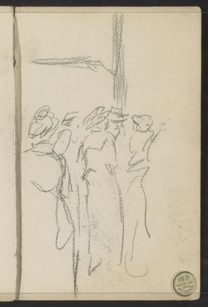 Curator: The stark lines in this pencil sketch suggest a world caught between industry and nature, an intersection frequently explored in late 19th-century art. Editor: It’s jarring. An unfinished quality lends a haunting ambiguity; it lacks a human touch, making the shapes seem less representative and more... spectral. Curator: Let's delve deeper. This work, entitled “Paard-en-wagen, mogelijk bij boten,” translated as "Horse and Cart, possibly near Boats," is by George Hendrik Breitner, and was created sometime between 1886 and 1908. It resides here at the Rijksmuseum. Editor: I immediately notice the prevalence of vertical forms – lines shooting up, lacking a foundation. Given that Breitner was working at a time of immense upheaval, industrialization, rising class conflict – I am keen to examine the horse as a visual motif. What resonances and dissonances were the artist drawing upon when featuring a horse in his sketches? Curator: Certainly, it evokes the past—but Breitner’s engagement seems complex. Notice the rapid, almost frantic marks—they signal not stability, but precariousness. Editor: And what does the form of the sketch signify, considering the societal pressures being manifested on the artist? Curator: The very openness of this sketch could be read as defiance, perhaps highlighting the temporary nature of progress or perhaps the way systems can simultaneously build up and decay. Editor: Perhaps, and in seeing that, I recognize the universal condition that’s visually embedded through cultural memory – uncertainty. The stark imagery feels surprisingly relevant in today’s environment. Curator: Exactly. Breitner manages to encapsulate a certain anxiety, a constant push and pull that mirrors the tensions felt during the turn of the century, which speaks volumes today. Editor: Ultimately, the horse can remind us that no matter what happens through any society or timeline, the underlying experience remains relevant.
