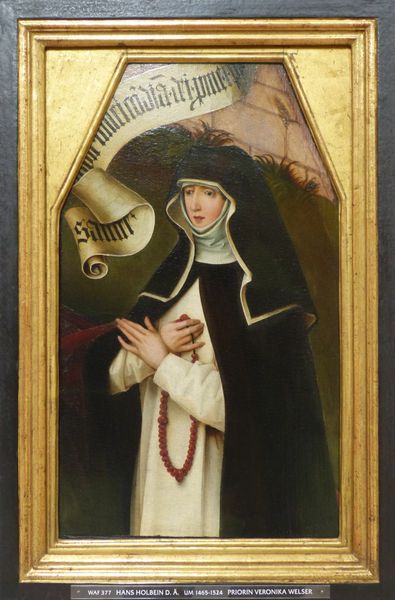 Curator: This compelling oil painting, dating roughly from 1525 to 1550, is called "Saint Gertrude of Nivelles and an Augustinian Canoness." The artist, unfortunately, remains anonymous. What’s your initial take? Editor: Serene. It’s deeply calming, despite the formality. There’s something about the light in the landscape backdrop, and how it throws the figures into almost stark relief. It feels very staged, very deliberate. Curator: Absolutely, a careful dance of devotion. The Saint is shown with her crozier and book, while the Canoness kneels in supplication. Consider how Gertrude’s crozier, a symbol of her abbatial authority, nearly pierces the heavens. Is it earthly power reaching for the divine, or the other way around? Editor: Ah, now you’re making me think. The crozier… traditionally, a shepherd’s crook. Leadership, guidance. But positioned as it is, almost a visual spear. Are we meant to consider her spiritual authority a form of power, a protective force? And the book in her hand - it all emphasizes learning, contemplation. The symbols really build up layers here, don’t they? Curator: They do. Gertrude, as the patron saint of travelers, innkeepers, and gardeners… there's an intersection there between physical and spiritual well-being, nurturing and guidance. All interwoven with potent cultural significance. And then we consider the Canoness... Her humble pose... Is it obedience? Or perhaps the potential for enlightenment? Editor: Her clasped hands mirror the stillness in her heart. Her attire suggests a rejection of worldly vanity in the service of her ideals. There's the dynamic that arises out of these contrasting images - power and devotion in the presence of this verdant natural setting, that makes one think about faith not as something separate from our world but integrated into it. The dark tree behind Gertrude becomes a supporting column and frames her presence with an intriguing weightiness. It echoes both the shadows of earthly existence and the growth that springs from life’s mysteries. Curator: Beautifully articulated. There is such subtlety in this unknown artist's ability to use familiar, almost rigid, iconographic elements to generate a real emotional presence, even after all these centuries. Editor: Agreed. Even within those confines of visual language, we're still connecting to a very human expression of faith. The artwork becomes a meditative act of prayer for both those depicted and for us as the witnesses centuries later.
