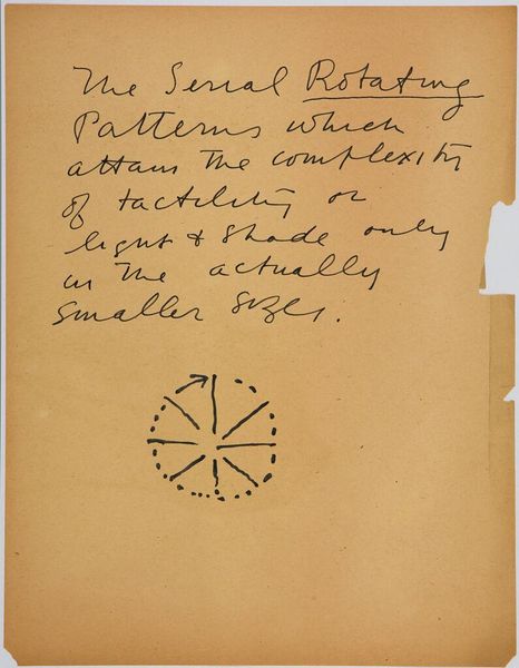 Editor: So, this is Stuart Davis's "Art Theory Text with Color-Space Diagram," created on paper, and dated 5/4/42. It looks like a handwritten note with a diagram. How do you interpret this work, considering its focus on color? Curator: As a materialist, I look at this piece as Davis wrestling with the means of production. He's reducing color to its basic components – black and white – almost as if to deconstruct the very act of painting. Do you see how the diagram echoes his exploration of color as a material constraint? Editor: It's interesting how he combines the diagram with his own written theory. Almost like he's workshopping in public. Curator: Exactly! The materiality of thought itself is on display here. It blurs boundaries between artistic intention, the labor of writing, and the social context of artistic creation during the 1940s. It forces us to consider what constitutes art, really. Editor: I see it now. Thanks, that's a great perspective!