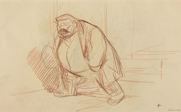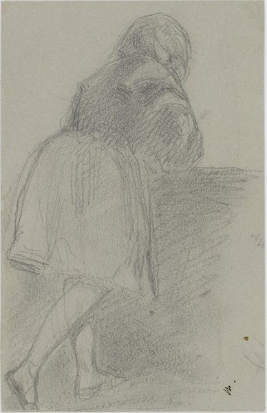 Curator: Today, we’re examining Thèophile Alexandre Steinlen's dry-media drawing titled "Cat." It's a study rendered in charcoal and dates to 1919. Editor: There’s a stillness to this piece. The weight of the cat’s haunches and bowed head gives a feeling of immense gravity. The monochromatic palette emphasizes this introspective mood. Curator: The cat has served as a potent symbol throughout history and across cultures. We see it here with an air of solemn contemplation that diverges quite significantly from the self-possessed cat figures found in ancient Egypt or, in our contemporary life, memes and cartoons. What interpretations come to mind? Editor: Symbolically, cats are complex. On one hand, there’s independence, and the hunt, on the other there’s darkness and witchery. I think here, because of the stooped position and the tonal register, there's a leaning towards the melancholic. We don’t see the power, the coiled spring, just a sort of weary resignation. The lines too add to this reading; see how they become faint and almost dissolving. It seems fitting, made in 1919, at the close of the Great War, for something to embody world weariness. Curator: Yes, that context really shapes my understanding as well. Steinlen depicts the weight not just of the body, but perhaps also the psychological weight of the time. His line quality lends it a sort of ghostly quality, reflecting perhaps a collective exhaustion. Editor: I see what you mean. It almost looks like a fading memory, sketched roughly. There's a sort of honesty in its bare composition that's particularly moving. Curator: It leaves one to consider how Steinlen’s "Cat" reflects both personal emotion and larger societal themes. Editor: It definitely transcends mere representation, becoming a vessel for universal feelings. Curator: Indeed, an unassuming image holding multitudes.