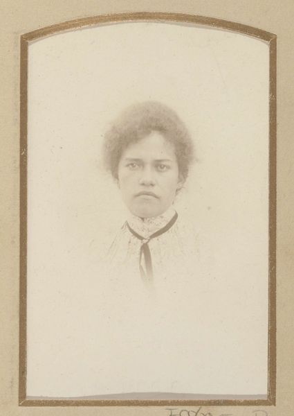 Editor: Here we have "Portret van (vermoedelijk) een Surinaamse vrouw aangeduid als Marie", a photograph by Eugen Klein, circa 1890-1915. There is a certain stillness to it, a sense of quiet dignity conveyed through a formal composition and the subject's direct gaze. How do you interpret this work through the lens of formal qualities? Curator: Notice first the oval frame, a classic choice for portraiture of the era, softening the geometric lines of the photograph itself. Klein plays with light and shadow, particularly evident on her face. Observe the subtle gradation creating depth and highlighting her features, almost like a chiaroscuro effect used in painting. It's an interesting play between the supposed objectivity of photography and the aesthetic considerations typically reserved for painting. Editor: So, the manipulation of light becomes a key element? Curator: Precisely. Consider the tonality – the muted sepia tones imbue the photograph with a timeless quality. The subject's clothing, though indistinct, adds to the overall composition. Can you see how the high collar creates a framing effect for the head and neck? It directs our gaze upwards. Editor: Yes, I see what you mean. The focus seems to be directed straight at her gaze, which creates the stillness. Is there anything significant about her posture? Curator: Note how the head is tilted slightly, yet her gaze remains level. It adds a dynamism that contradicts the still pose and infuses it with life, yet it retains symmetry and control in her personal composure. What do you think? Editor: It’s like a paradox. Formality meets subtle dynamism. Thanks to you, it's easier to appreciate how the form drives the meaning of the work. Curator: It shows the expressive potential embedded in photography by paying careful attention to light, composition, and balance. An excellent conversation; thank you for your perspicacity!