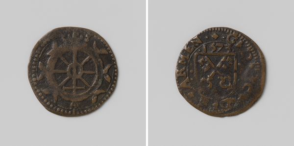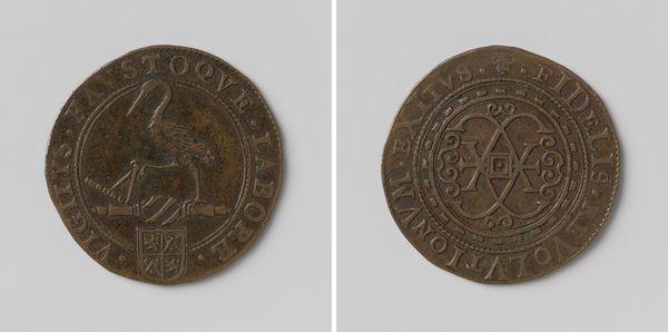Editor: So this is an allegorical reckoning, or accounting, penny, minted in 1622 in Gelderland, likely made from metal. The square shape is striking. I'm also interested by its use of iconography like the lion and pelican; there’s almost a medieval heraldic feel to it. What does this piece evoke for you? Curator: This medal is indeed a fascinating artifact of its time. Consider the political climate of 1622. The Dutch Republic was in the thick of the Eighty Years' War, fighting for independence from Spain. These seemingly decorative emblems become powerful symbols. What do you make of the placement of those emblems on either side of the coin? Editor: The placement makes me think that the figures might represent different virtues or guiding principles? The lion could symbolize strength and courage… but what about the pelican? Curator: The lion traditionally represents the province of Gelderland, a symbol of power. And you’re right, that's a pelican, traditionally a symbol of self-sacrifice, particularly Christian charity. In times of war, those virtues had renewed importance for the people. The inscriptions are telling as well: "SIC.VI.PERIUM.AT" on one side and "VIRTUS.PIETAS." on the other side. Think of them as propaganda in coin form, aimed to solidify cultural and political sentiment at that time. Editor: That’s interesting, it's like a little portable monument to specific ideas! How were they used at that time? Was it literally currency, or more like commemorative medals? Curator: They would be calculation tokens as a form of currency or for administrative record. In a time when currency was fluctuating and precious metal easily hoarded this would represent government accountability. It’s meant to create an image of stability and strength which is a fascinating choice given that Gelderland and other Dutch territories were engaged in open conflict at that time. Editor: I had no idea these tokens could tell such a layered story. Seeing it as a historical object rather than just a decorative object makes all the difference. Thanks! Curator: Indeed. And looking closely at even simple works reveals insights into our shared history.