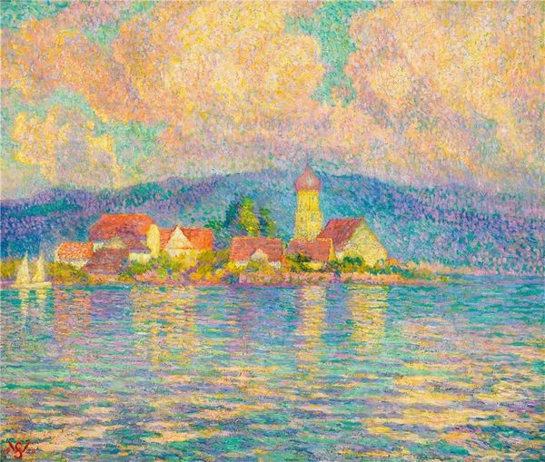 Editor: This is "Nonnenhorn," an oil painting by Willy Schlobach. It appears to depict a waterside cityscape, shrouded in a soft haze. What catches my eye is the interplay between the yellow sky and the cool blue reflections in the water. How do you interpret this work through its formal qualities? Curator: Precisely. Let's consider the syntax of Schlobach's visual language. Notice the distinct brushstrokes – how they build up a sense of atmosphere rather than precise forms. The lack of sharp delineation is deliberate. The colour palette too. Schlobach focuses our attention on the composition’s intrinsic elements. Do you observe any underlying geometric structure within the seemingly amorphous forms? Editor: I see how the verticality of the church spire punctuates the horizontal bands of water and sky. There’s definitely a structural balance at play, even though the details are softened. It's not just a straightforward depiction; it seems like something more. Curator: Exactly. We move beyond pure representation and enter the realm of sensation. Consider the surface texture itself. The visible brushwork creates a tangible, almost tactile quality. How does this emphasis on materiality contribute to your experience of the artwork? Editor: It makes it feel very immediate and present, less like a window onto a scene and more like an object with its own presence. The colours aren't blended perfectly, either; they almost vibrate next to each other. Curator: Yes! This juxtaposition is key. The artist’s formal arrangement affects our perception and feeling, inviting us to ponder on colour, shape, and material. Ultimately, decoding "Nonnenhorn" using formalism opens rich interpretations by delving into its inherent visual components. Editor: That makes sense. By concentrating on the visual elements themselves and disregarding any external context, we see that the artwork achieves its meaning through its material properties and the artist's syntax. I've learned something new today.