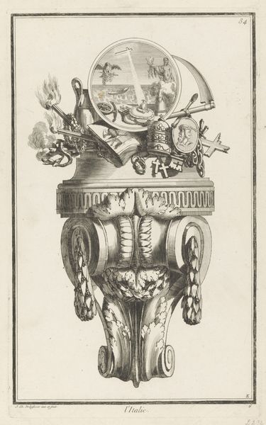 Editor: This engraving, "Trofee met rond schild," or "Trophy with Round Shield," created in 1779 by Gottlieb Friedrich Riedel and held at the Rijksmuseum, strikes me as quite celebratory and regal, though I find myself wondering about the message it’s trying to convey. What do you see in this elaborate piece, and how might its historical context influence its interpretation? Curator: The “Trophy with Round Shield,” reflects the prevalent fascination with classical antiquity in late 18th-century Europe, showcasing power, wealth, and sophisticated taste through idealized representations. The display of weaponry and armour wasn't just aesthetic; it was a direct reference to valor and authority, ideals deeply rooted in societal power structures of the time. Why do you think Riedel chose this particular combination of symbols for his print? Editor: Well, the shield prominently features classical figures, almost like a miniature frieze, so it definitely elevates the martial elements beyond mere practicality. Maybe the arrangement itself is intended to ennoble the patron? Curator: Precisely. It served as a signifier of erudition and refinement intended for a specific audience. Do you think this image could function independently or do you imagine it served a broader purpose, perhaps within a book? Editor: I hadn't considered that! Given it’s a print and its somewhat decorative nature, maybe it was meant for dissemination and education, showing others how to present themselves, or perhaps for display in interiors. I am just wondering now, who was the target demographic that could actually grasp the cultural weight packed in such imagery? Curator: It's a very astute question, underscoring how artistic patronage was linked with specific socio-political agendas. Ultimately, this artwork reveals how artistic imagery functioned as a tool in shaping cultural and political landscapes. Editor: This has certainly shifted how I perceive it, making me reflect more on the socio-economic dimensions embedded within such works!
