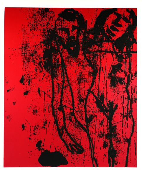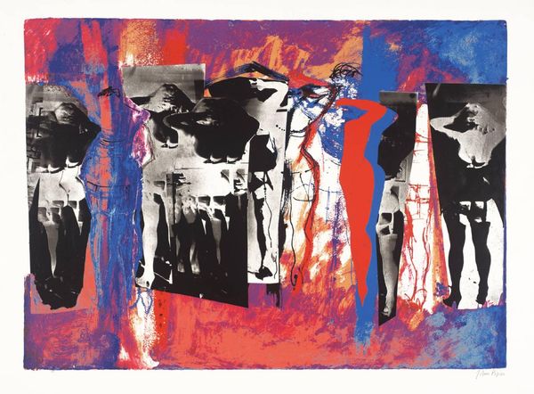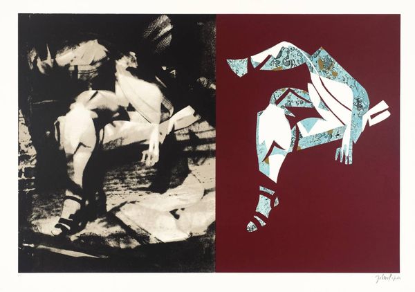 Curator: John Piper's "Eye and Camera: Red and Black" presents a striking contrast in form and color. What is your immediate reaction to it? Editor: Hmm, divided. Like looking at a before-and-after shot, or maybe a fractured memory, something half-remembered, half-felt. Curator: The print showcases Piper's interest in the materiality of art-making, combining photographic elements with abstract expressionism. Notice how the swirling, marbled texture interacts with the figurative elements. Editor: It's a clash of worlds, isn't it? The red figure feels raw, immediate, set against this almost clinical black and white image. Like a scream versus a whisper, both framed by thorny foliage. Curator: The imagery suggests to me a dialogue between subjective perception and objective recording, challenging our notions of realism and representation through juxtaposing handmade marks with mechanical reproduction. Editor: I like how it messes with your head. It's unsettling, even. But beautiful. Makes you think about seeing, feeling, remembering... and what it all means. Curator: A fascinating example of Piper's ability to weave together seemingly disparate visual languages. Editor: Yes, a potent blend that lingers, forcing a double-take on how we piece together realities.