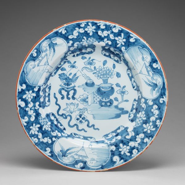 Editor: Here we have "Saucer", a porcelain print from around 1725 to 1735, made by Ignaz Preissler. It's currently housed at the Metropolitan Museum of Art. It's interesting, the color scheme is very simple but the layout seems almost overly busy with details and images. What do you see in terms of structure? Curator: Note the tripartite division of the design: the central roundel presenting a miniaturized landscape, encircled by an intricate patterned band, and finally, an outer register teeming with figures and rococo motifs. It is, formally, a plate divided into spaces, demarcated and differentiated from one another by means of line and composition. Do you notice how the use of negative space is regulated carefully to articulate shapes? Editor: Yes, now that you point it out, I see how negative space shapes figures, creates a strong border. It’s almost like each object gets equal space. But I wonder why so many different elements are crowded into a relatively small space. Curator: Perhaps the density reflects an aesthetic sensibility emphasizing ornament and visual complexity, characteristic of the Rococo period. Preissler seems to play with flatness and depth in order to maximize symbolic exchange across visual boundaries. Editor: So it's like he's packing a lot of statements into this small ceramic piece through clever utilization of space. This gives me a new perspective. Curator: Indeed, appreciating its design invites an exploration of spatial composition and chromatic distribution, which may give way to different interpretations across various cultures. Editor: That makes a lot of sense. Now I see how focusing on the structure can open up even more questions and possibilities. Thank you for your insights!