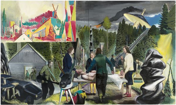 Curator: Standing before us is "Mars" by Neo Rauch, completed in 2002. It's an acrylic on canvas, a rather large painting, and it immediately strikes you, doesn’t it? Editor: Absolutely, that central figure is impossible to miss. He looks like a dishevelled Olympian, wielding a flimsy stick in front of what seems to be some kind of coastal catastrophe. Curator: Coastal catastrophe, I like that! There is definitely a sense of upheaval here. I'm seeing all sorts of clashing elements, like that snake twisting around his legs. It feels very personal and a bit perplexing. Editor: Snakes carry a lot of symbolic baggage, don't they? Transformation, healing, deception... Here, that almost cartoonish rendering clashes with the apparent realism of the main figure and the slightly sinister, yet strangely idyllic background. It almost feels like an apocalypse rendered as socialist realism. Curator: Rauch often blends historical painting styles and propaganda aesthetics, creating a really uneasy and ambiguous narrative space. Even the way "Mars" is presented in that speech bubble suggests a disrupted communication, as though something is breaking down or transforming into something unrecognizable. Editor: That deconstructed speech bubble definitely enhances that idea of breakdown. Communication is garbled, or perhaps being reborn in some strange form. Then, we have those figures in the background seemingly fleeing... What a mix of dread and calm. Are they worried, oblivious, or simply resigned? Curator: And that is quintessential Rauch. The blending of personal anxieties with grand historical narratives… There's almost a subconscious landscape being laid bare on the canvas. It’s like a dream, filled with recognizable yet strangely displaced symbols and actions. Editor: It is a dreamscape, for sure. Perhaps, the artist grapples with the burden of historical memory or even critiques his own role as an artist amidst chaos? Curator: Perhaps, the ambiguity is the whole point. To remind us of the subjective and ever-shifting nature of perception itself. Well, however it moves you, it certainly makes you ponder, doesn't it? Editor: Indelibly. It's a landscape of the mind, potent in its dreamlike complexity, one you can reflect on endlessly.