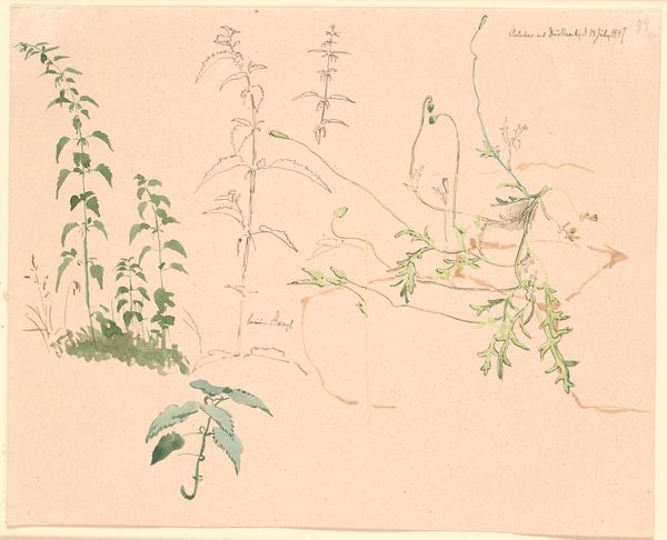 Curator: This watercolor on paper, crafted in 1904, is entitled "Voksende kodriver i solskin," or "Growing Primrose in Sunshine," by the Danish artist Fritz Syberg. Editor: It's unexpectedly muted for a "sunshine" picture, isn’t it? I feel like I’m peeking into a secret garden just after sunrise, or maybe even a moment before the first rays hit. There’s a tender, almost wistful quality to the light. Curator: Syberg, associated with the Funen Painters, was deeply invested in depicting the Danish landscape and rural life with a naturalistic eye, though his work also embraced impressionistic influences. Editor: I see that! Those rapid, almost frantic lines suggesting the ground... they give a sense of constant motion. And the color palette, that gentle clash of dusty rose and silvery green – it's as if the scene is breathing. I almost expect the leaves to rustle if I listen close enough. Curator: The Funen Painters sought to move away from the academic strictures of the time, embracing plein-air painting and depicting the world around them with authenticity. The primrose itself would have been a readily available subject in the Danish countryside. Editor: Makes you wonder what caught his eye that day, right? What did Syberg feel, standing there with his watercolors, capturing these fleeting blooms? To me, it feels like more than just botanical accuracy – there’s this intense focus on texture, the veins in the leaves, the delicate unfolding of the flower. It is about nature but not detached. Curator: Well, these depictions contributed to a growing sense of national identity at the time, connecting viewers with the specific flora and fauna of Denmark, reinforcing notions of belonging and regional pride. Editor: Huh. I get so caught up in the personal connection to the art; I forget it has this whole other public life. It makes sense, though. Syberg's art becomes this quiet celebration, grounding you in time and place. It captures this essence of Spring in a Danish garden, but it resonates now, here. It just has such intimacy! Curator: Precisely. The painting serves as a subtle reminder of the profound relationship between humans and the natural world. Editor: Well, for me, it’s just whispering, “Pause. Look. Breathe.”